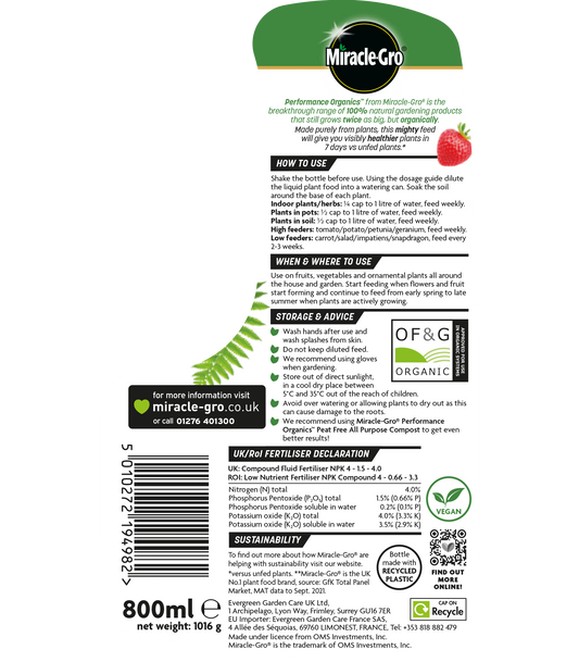 Miracle-Gro Performance Organic All-Purpose Liquid Concentrate Food 800ml