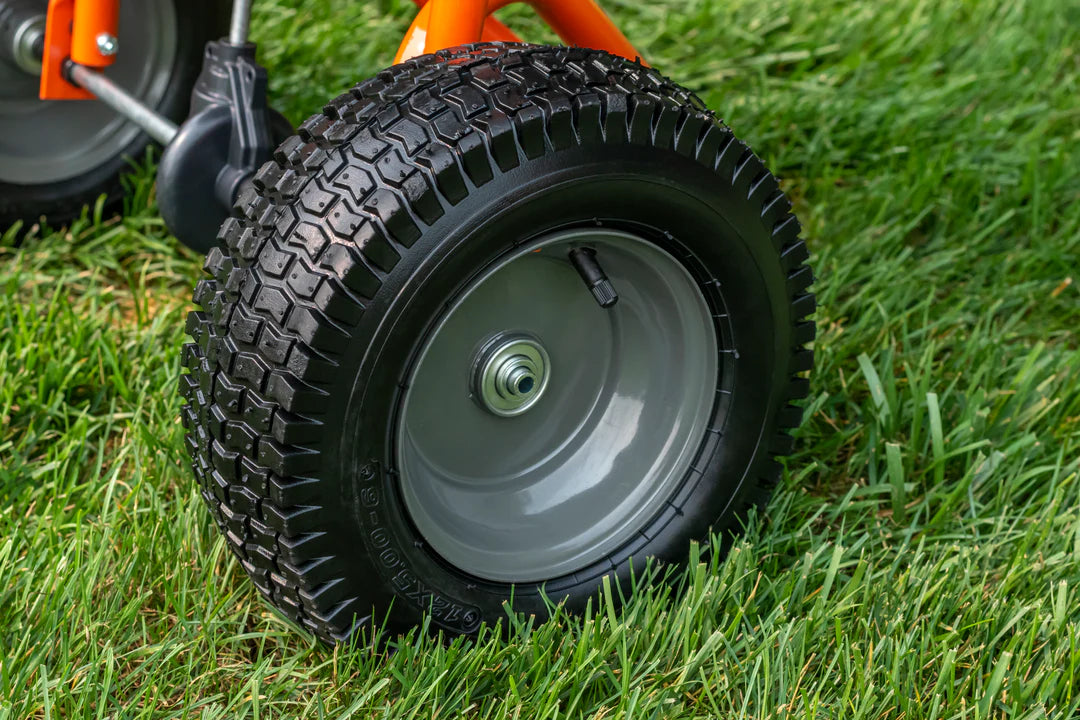 Cover up to 1/3 acre with its 110 lb. capacity, and the large pneumatic tyres make it easy to maneuver on any terrain. Built to last with an enclosed gearbox for increased product life. Achieve optimal results every time.