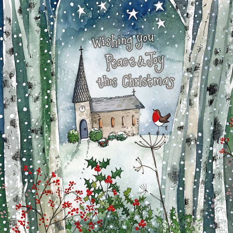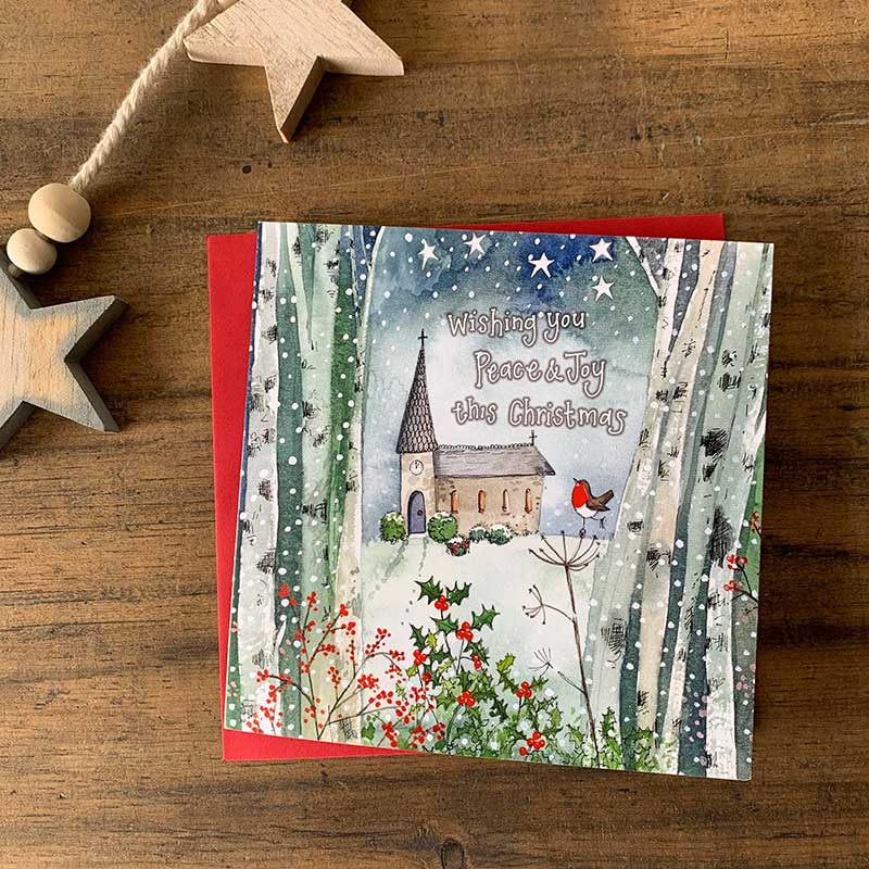 This set of boxed cards by Alex Clark features a special design of a church during the Christmas season.