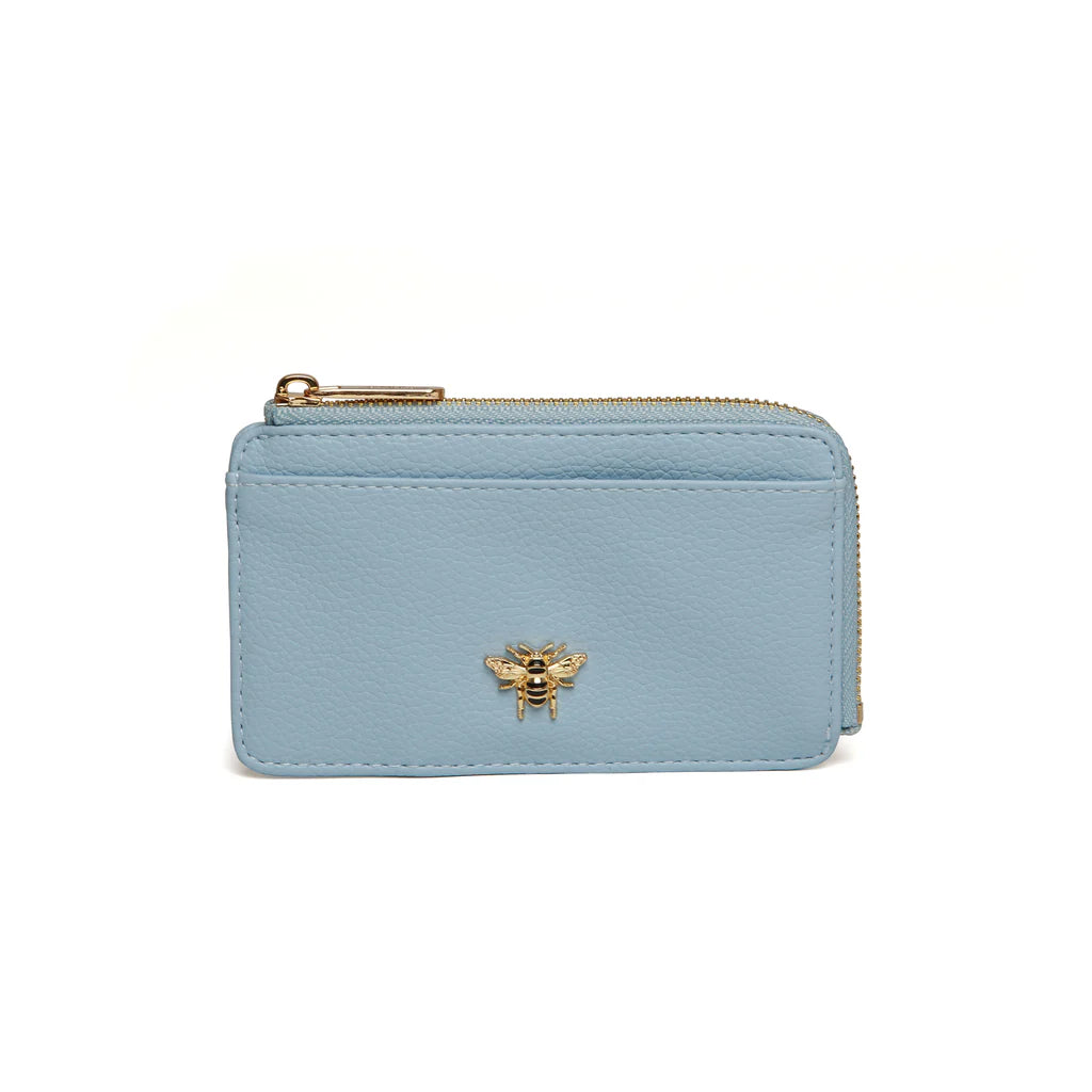 It features a secure zipped closure that opens across the top and down the side for easy access to coins. The front pocket is adorned with the signature metal Bee, while the reverse side offers an additional pocket and dedicated space for several credit cards. Compact and functional, this purse is designed to keep your essentials neatly organised.