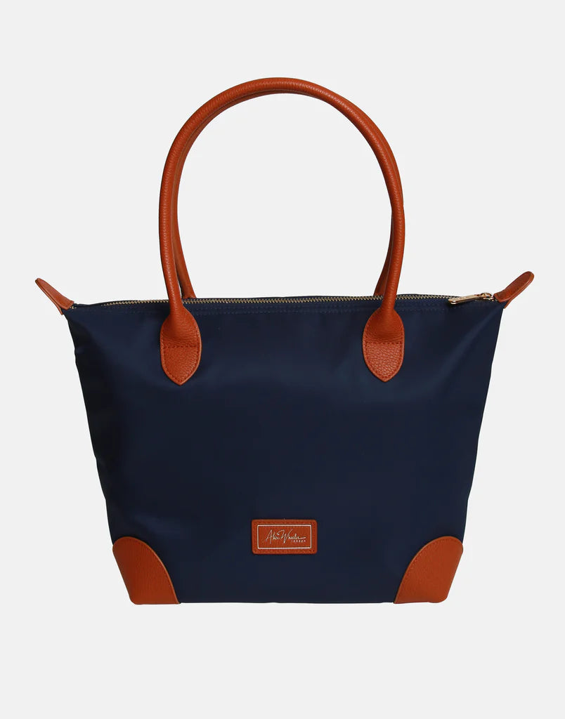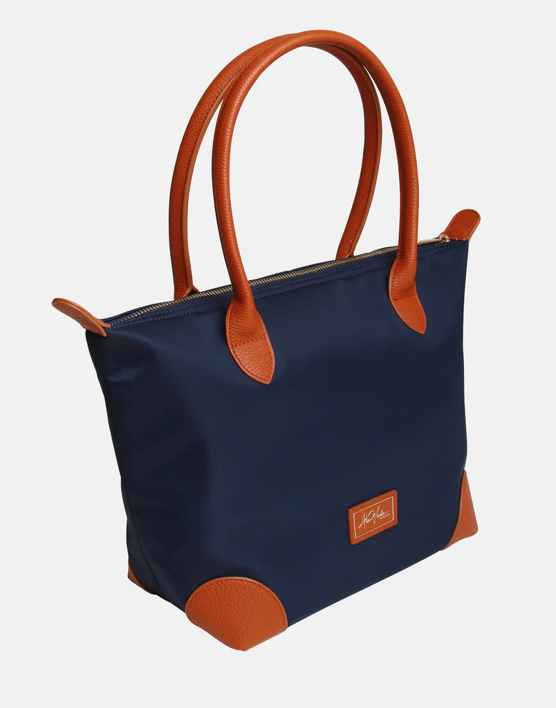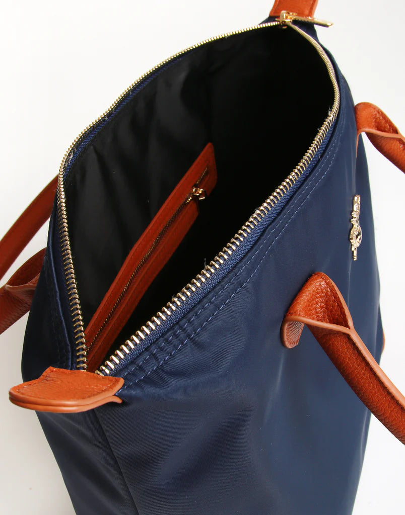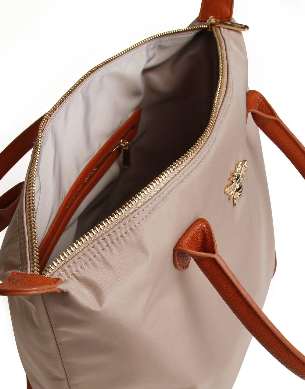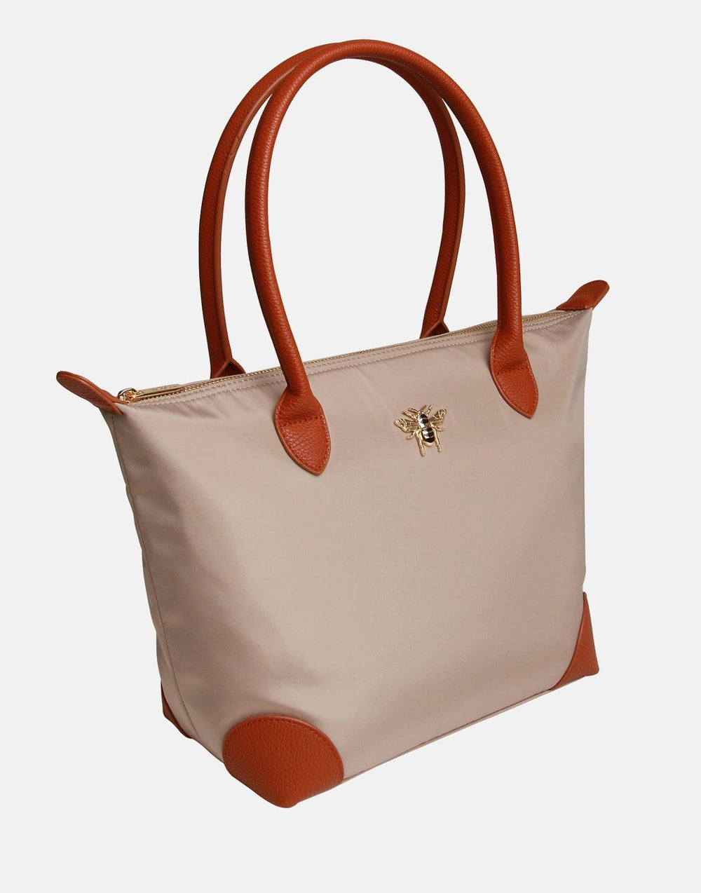 The Tote Bag is crafted from super lightweight material with tanned vegan leather accents, designed for both style and convenience.