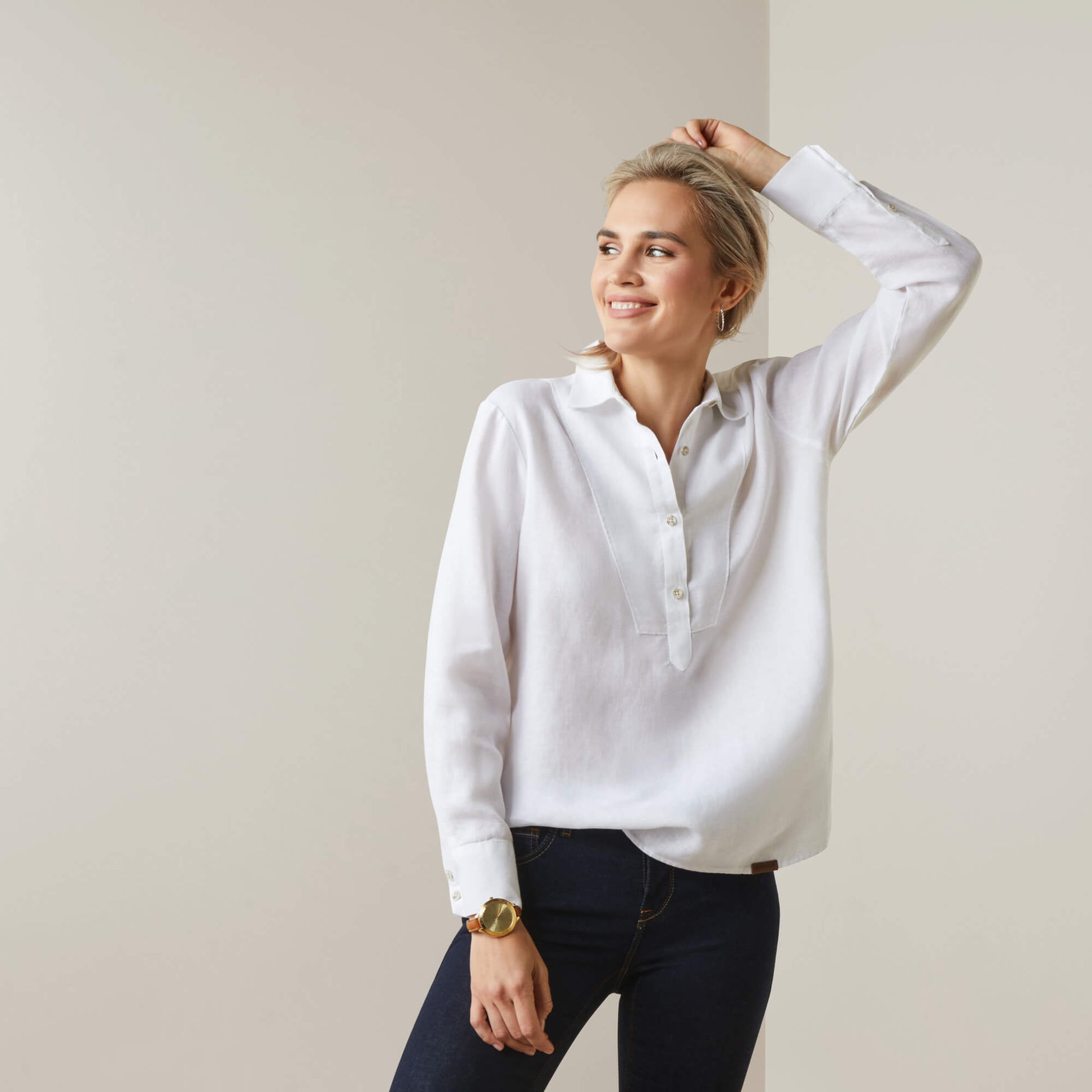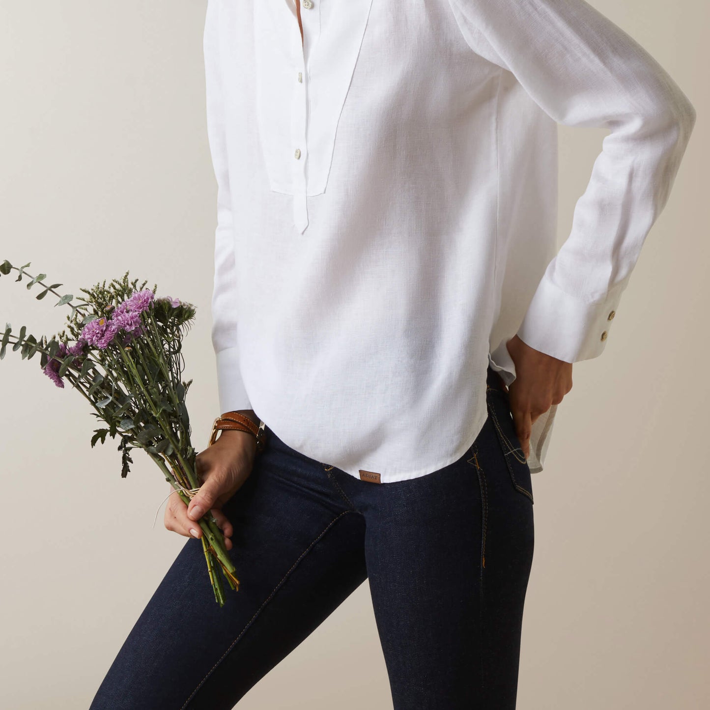 Lightweight and breezy, this linen top earns its countryside accolades with its stylish bib front construction.