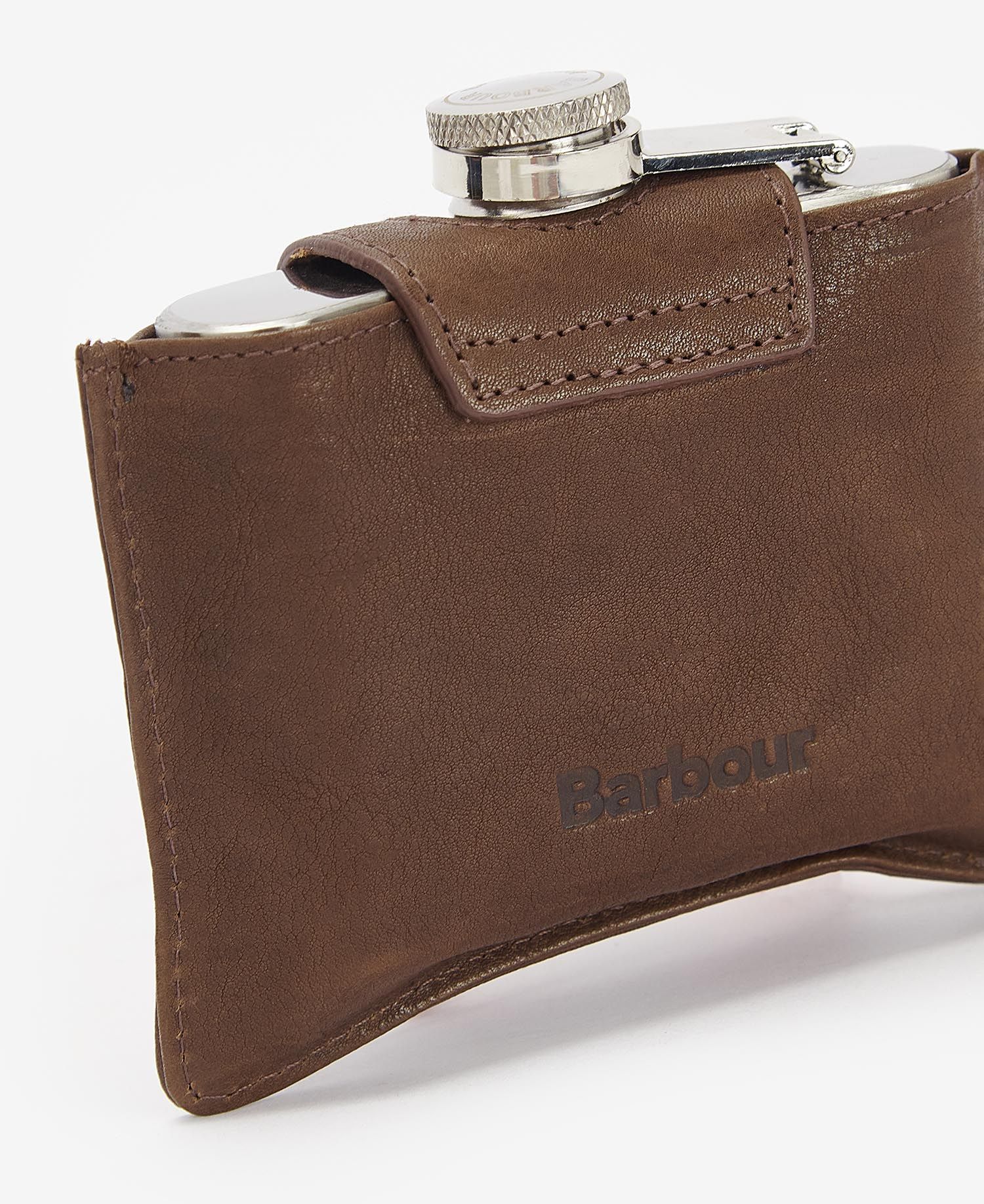 Presented in a Barbour gift box, this hip flask is made from stainless steel and comes complete with a real-leather case featuring a branded stud fastening. The screw-top lid has a hinge for easy use on the go.