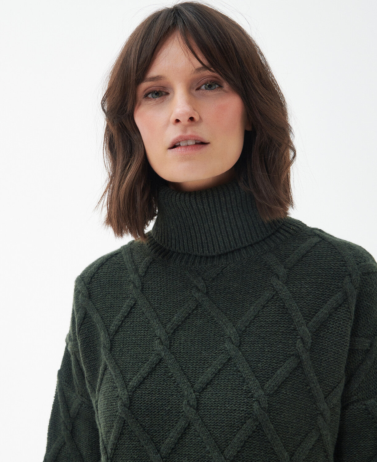 The chunky cable stitch roll neck is made from a wool blend and features deep side splits and a stepped hem. Rib at the neck, cuffs and hem help create a snug fit. A Barbour ID bar on the back neck ensures authenticity.
