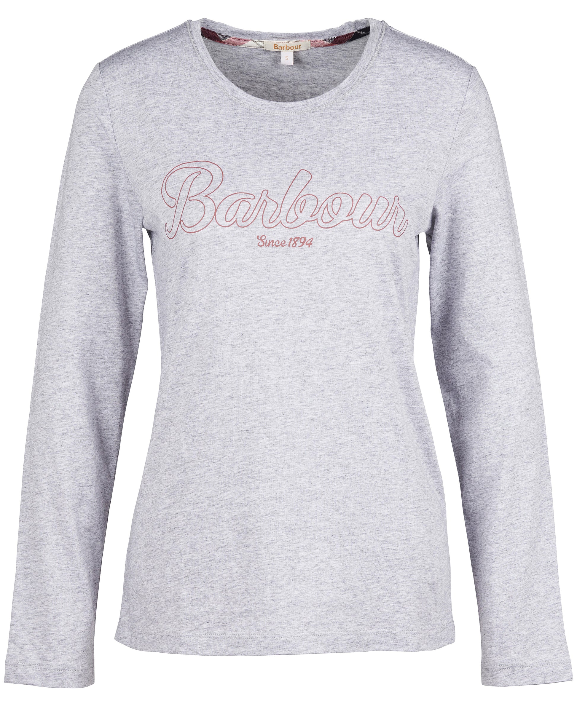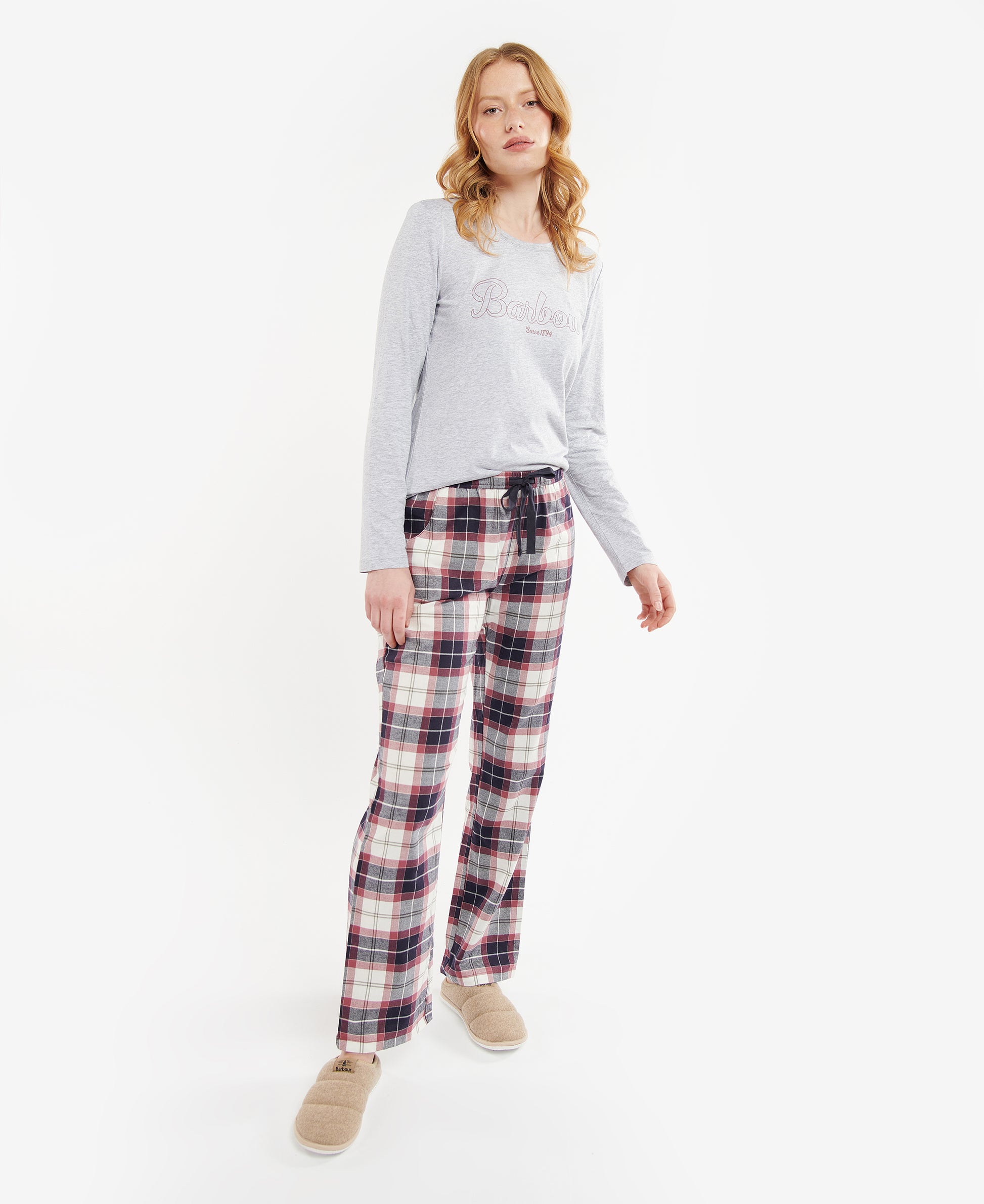 The cotton-blend top features Barbour script print across the chest, while the bottoms come in a tartan pattern with a tie-up fastening at the waist.