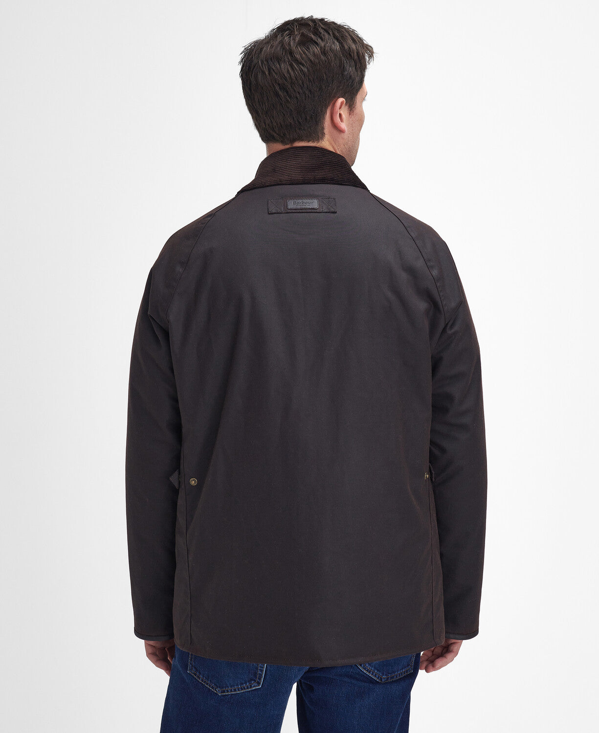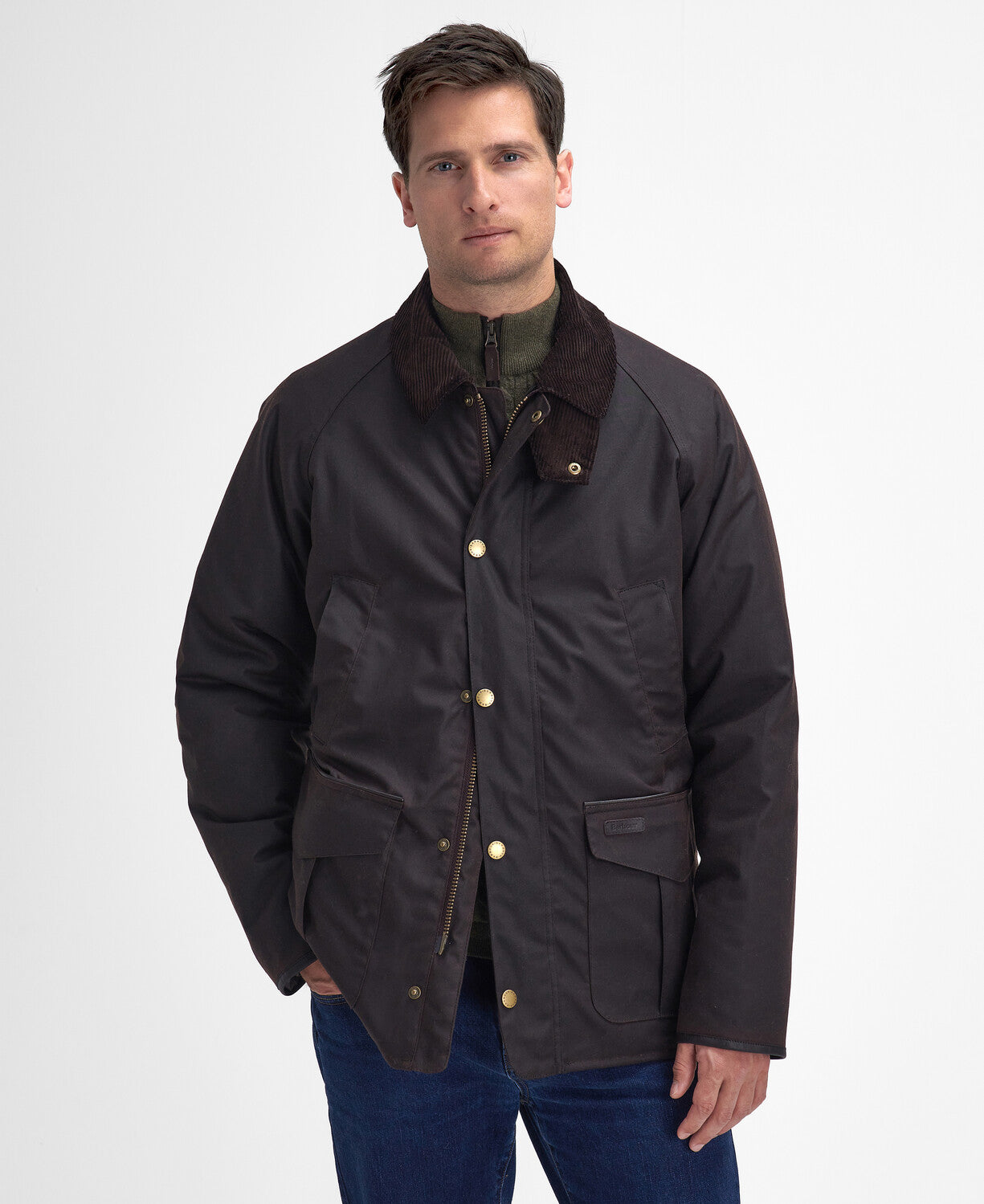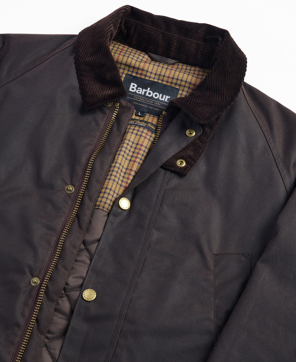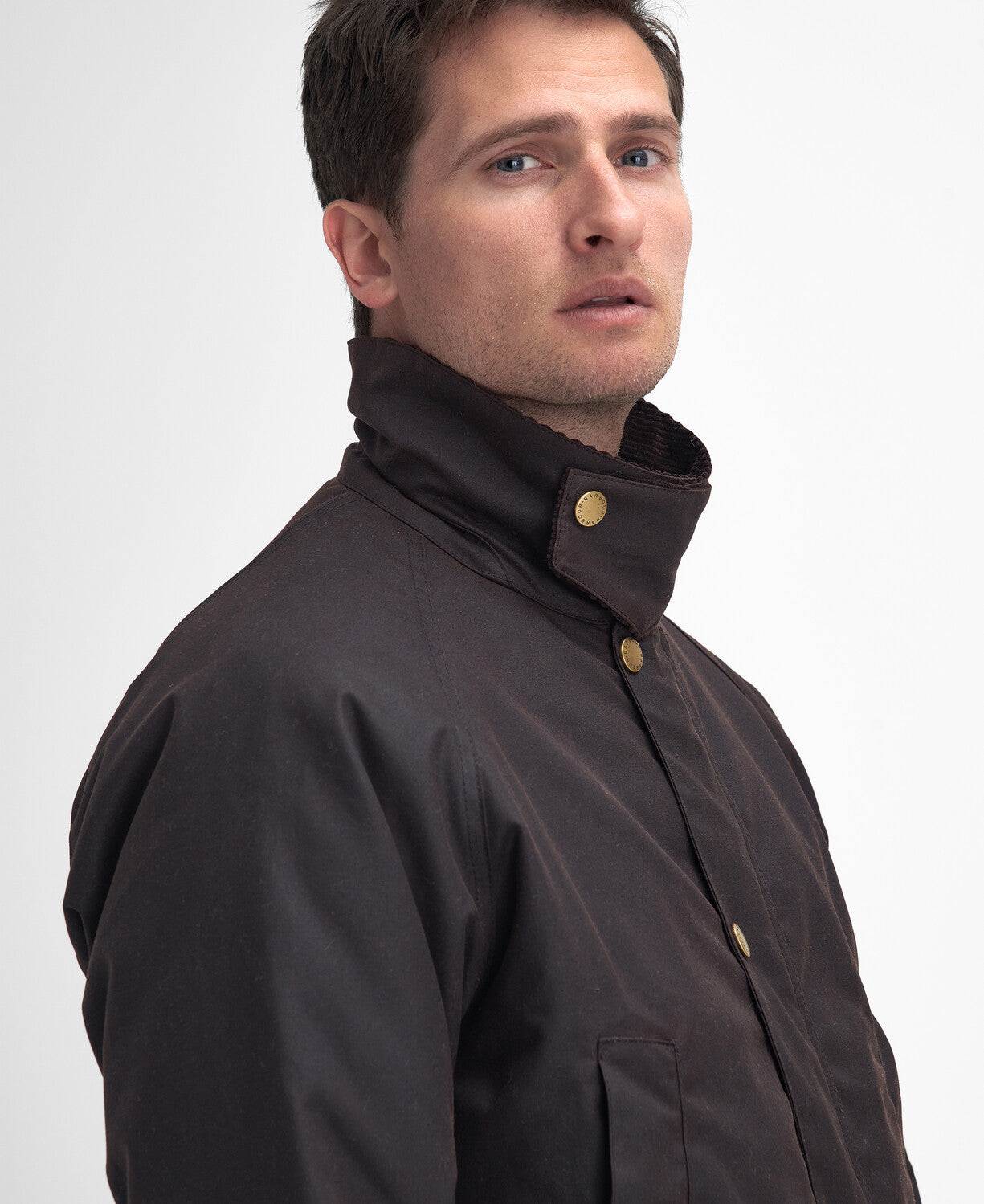 Crafted from 8oz waxed cotton, this jacket is perfect for countryside life. The leather trims and box pleated pockets add a touch of refinement to this classic style. Stay warm and protected with Barbour's signature cord collar and handwarmer pockets.