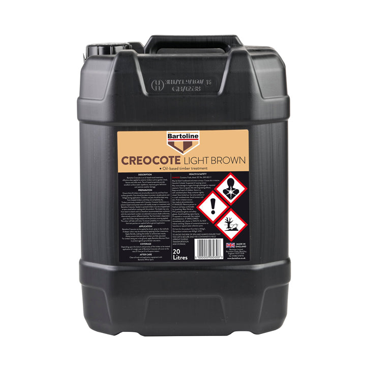 British Made in the Oakmere factory. Bartoline Creocote is developed as a safer, more environmentally friendly alternative to creosote, which is no longer available for retail use. Also available in a dark shade brown.
