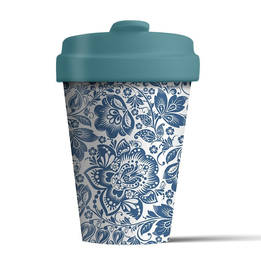 Blue Flowers, reusable, eco-friendly coffee cup with a blue lid