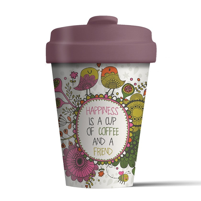 Coffee Happiness, reusable, eco-friendly coffee cup with purple lid