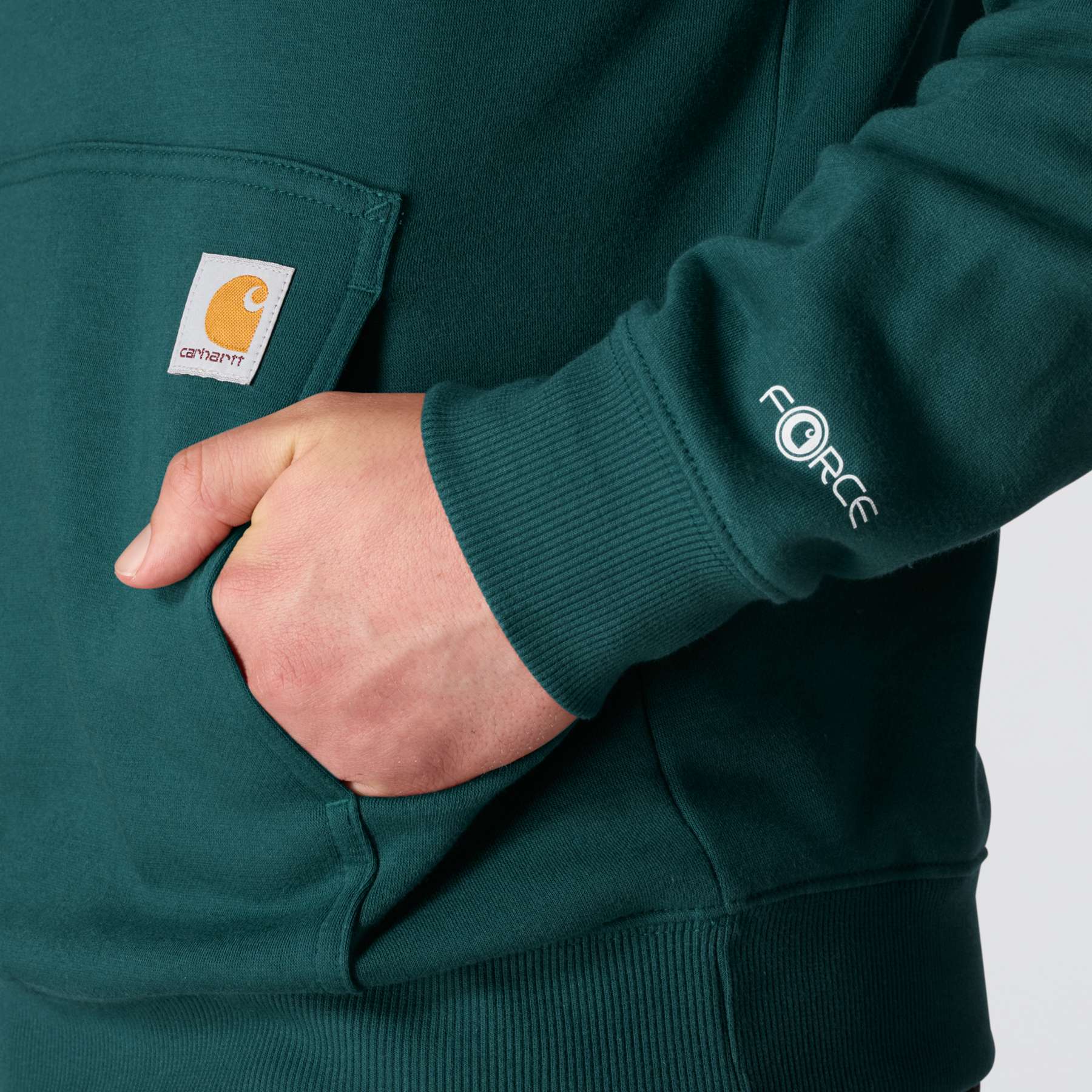 - Carhartt Force™ label on left sleeve and sewn-on Carhartt patch at pocket