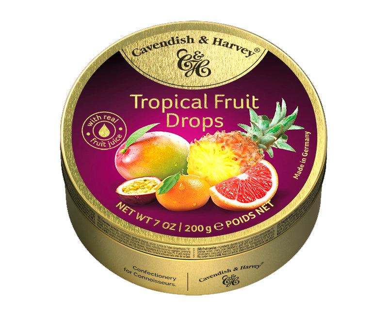Cavendish & Harvey's Tropical Fruit Drops are a delicious treat made with real fruit juice, dusted with icing sugar and sealed in a premium gold tin for a fresh, irresistible taste. Enjoy the unique blend of exotic flavours like calamondin-orange, mango, grapefruit, passion fruit and pineapple starting with your first bite.