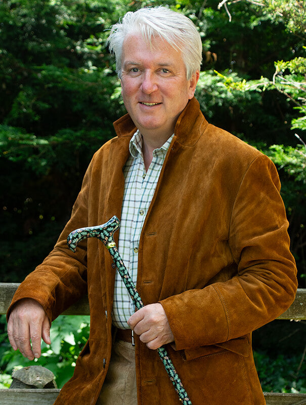 - A smart walking stick, patterned with oak leaves and acorns on a black background.