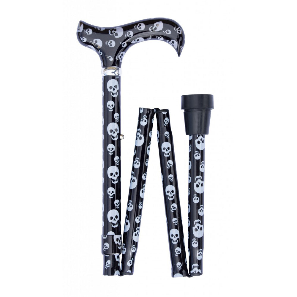 - This distinctive and unusual folding derby cane features a pattern of silver-grey skulls of various sizes on a black background