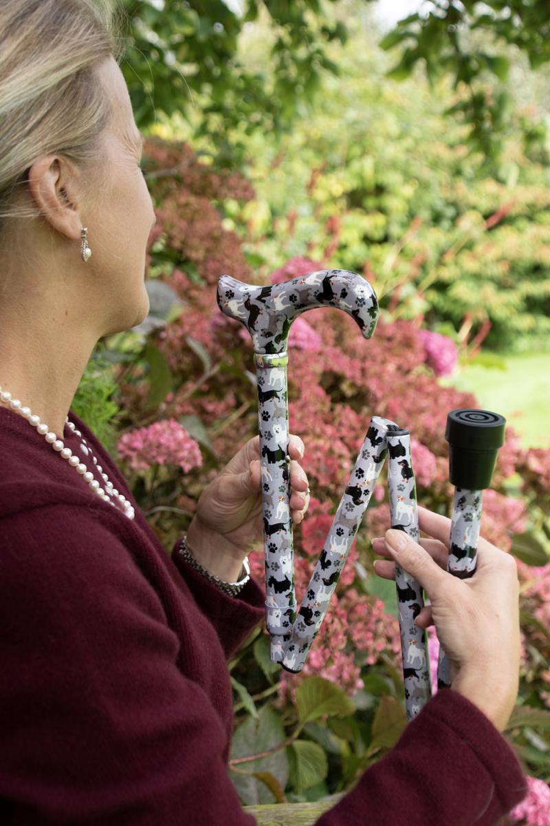 - A dog-lover's folding cane patterned with several breeds of small dog (West Highland White Terrier or Westie, Dachshund, Jack Russell, Cairn Terrier and Scottish Terrier or Scottie Dog), interspersed with pawprints on a grey background.