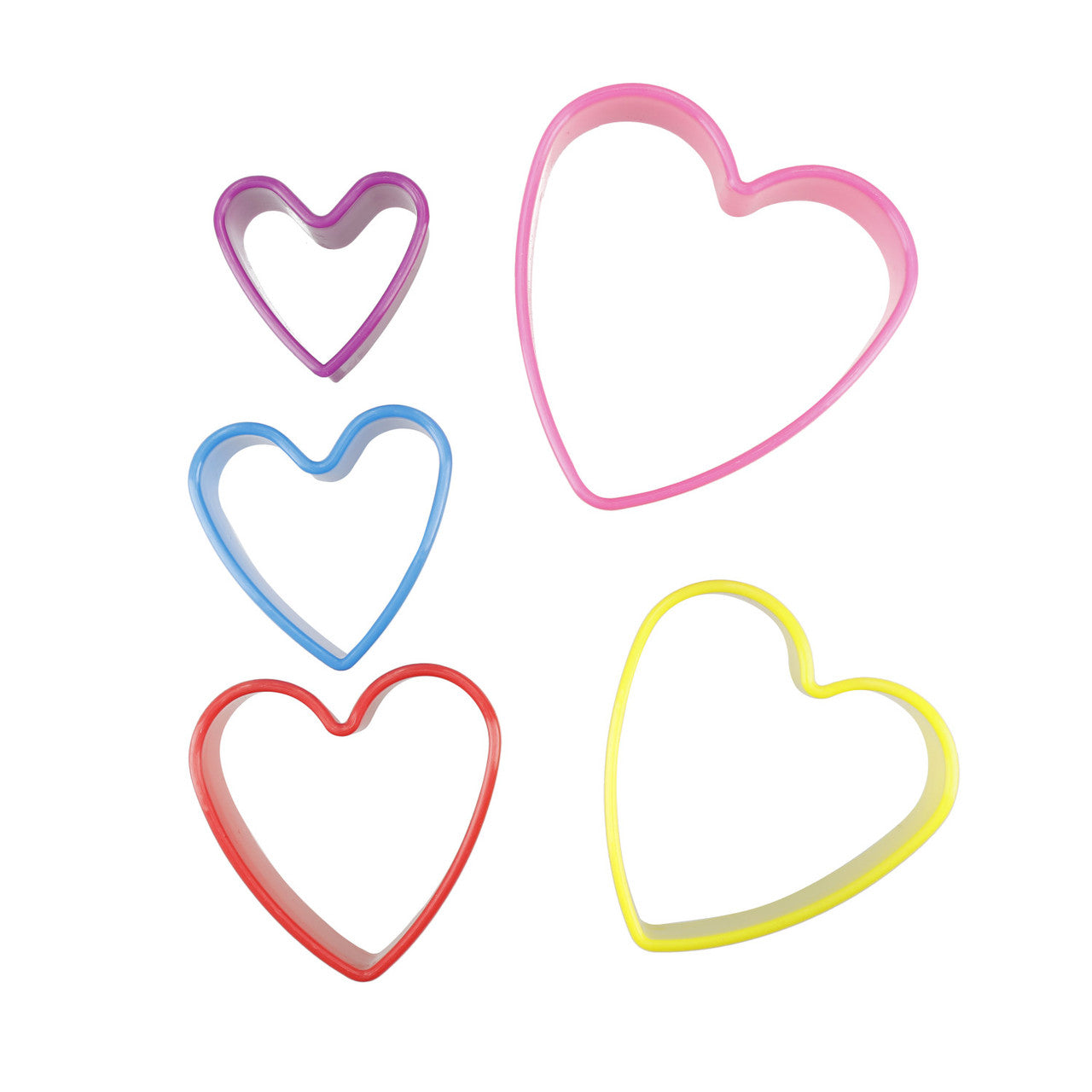 There are five plastic cookie cutters in this set, which cut heart shapes of: