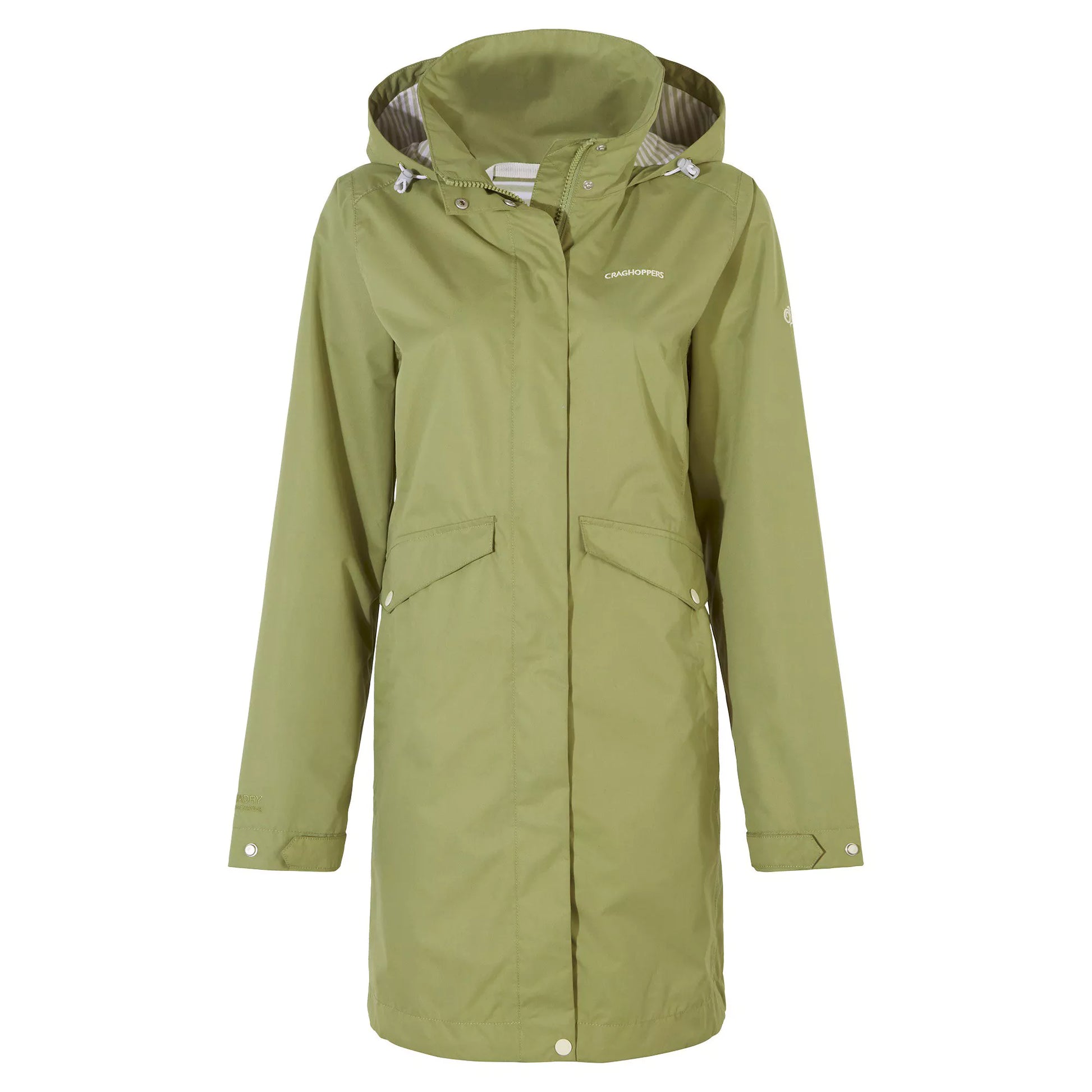 Craghoppers Larissa Waterproof Jacket has a streamlined AquaDry Membrane construction with EcoShield DWR. It also comes with a striped jersey and taffeta lining in contrasting colours, a grown-on hood, and a storm-flap.