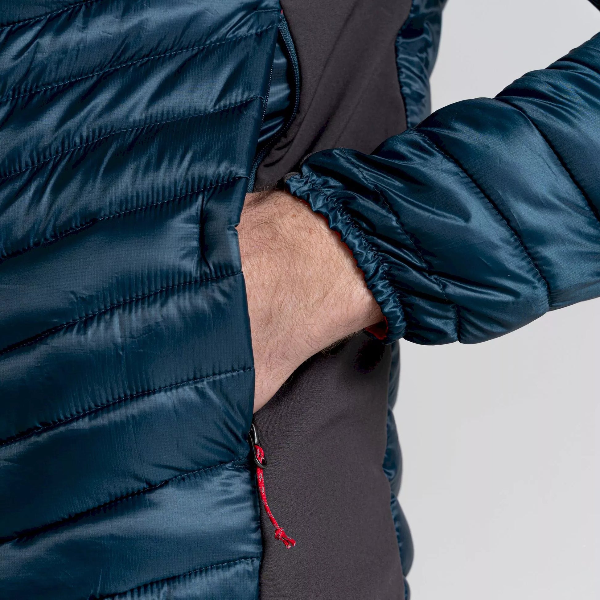The slender diagonal baffles channel high-loft ThermoPro synthetic fill close to the body, helping to trap body heat at the core, while the fleece-backed softshell panels to side and underarm sections offer extra agility. Lightweight, packable construction.