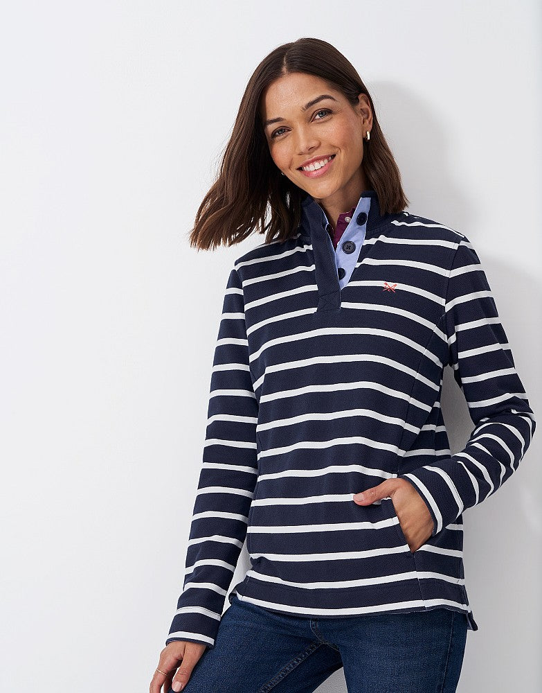 A half-button sweatshirt in a selection of new stripe designs.