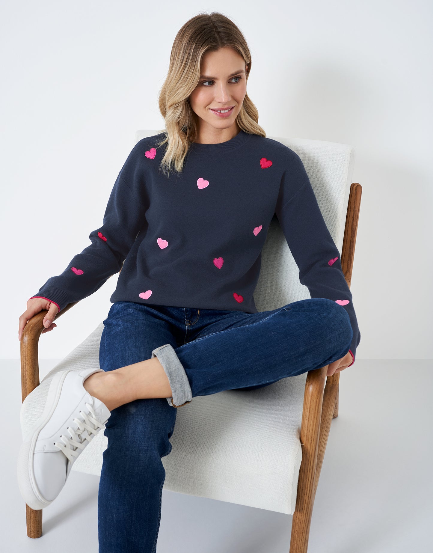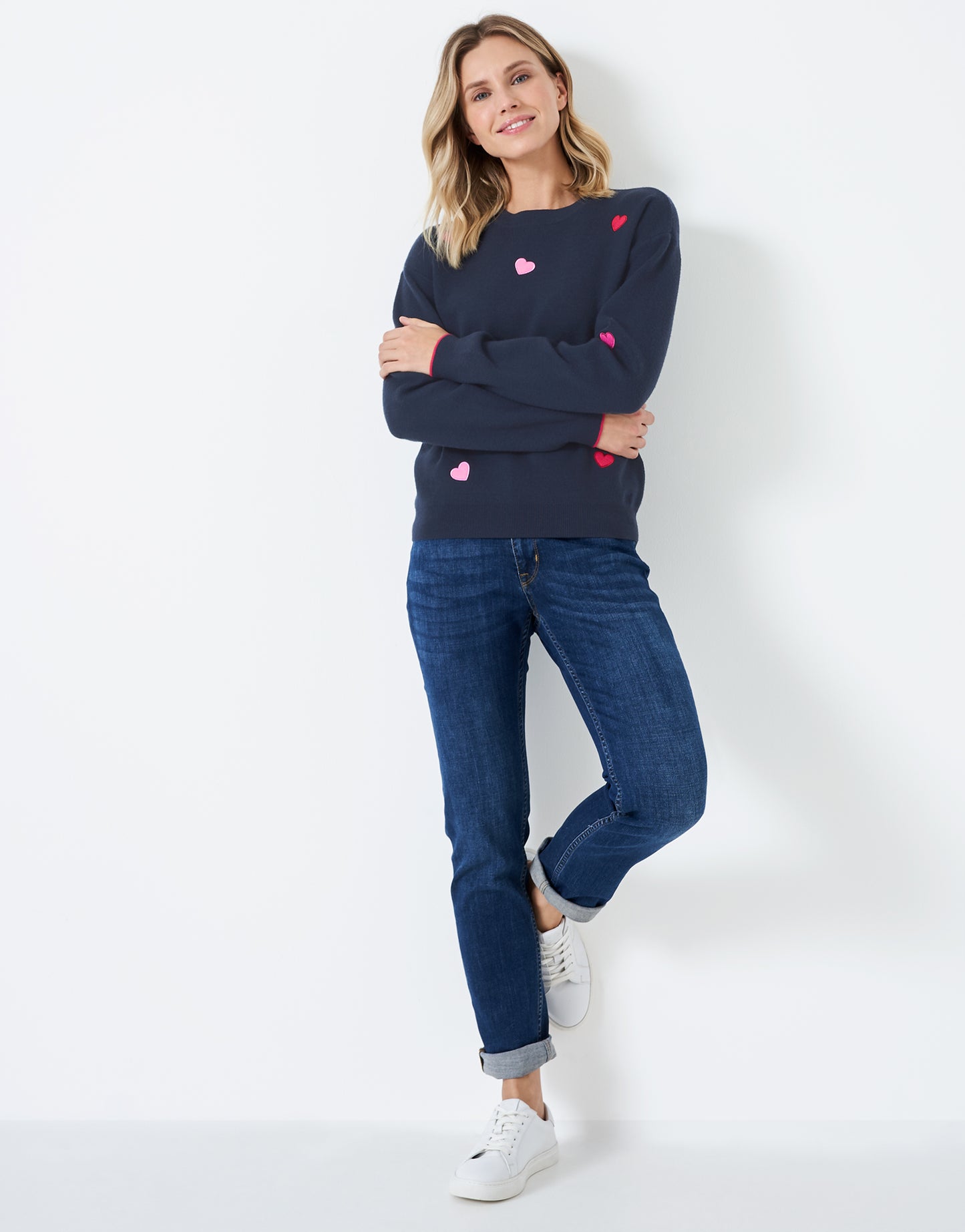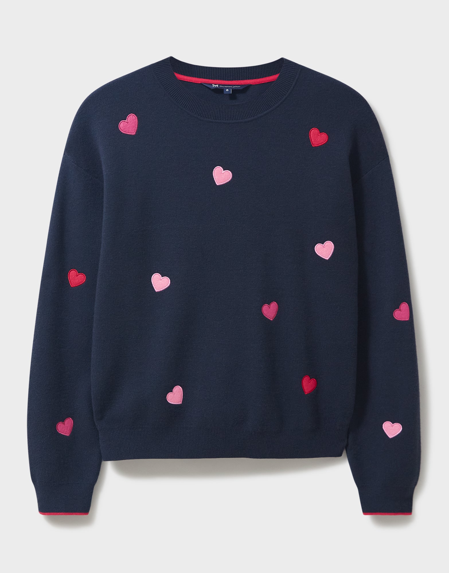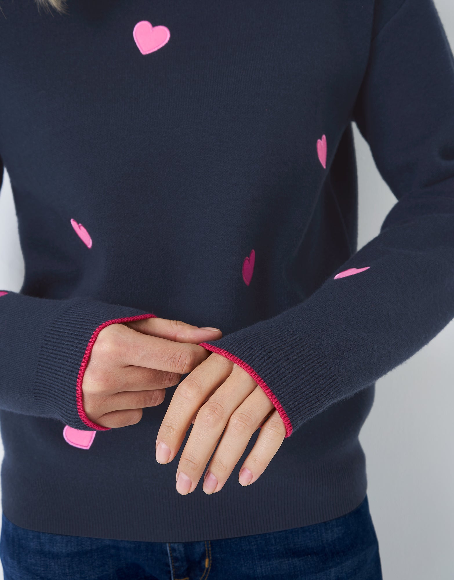 Navy jumper scattered with hearts.