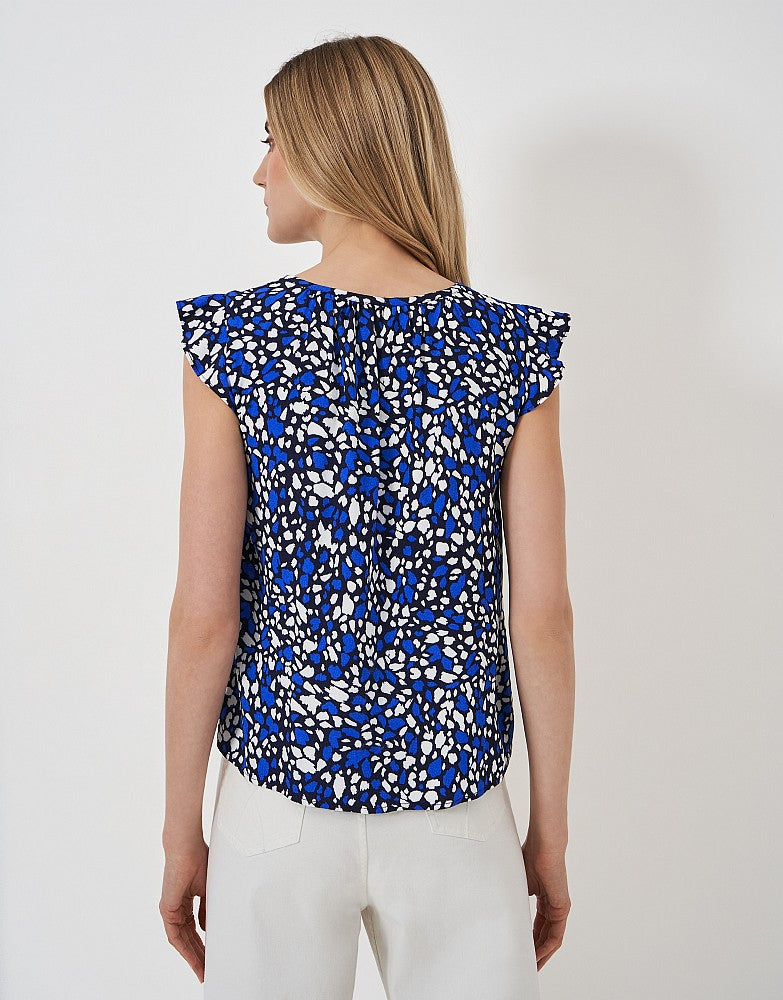 Adorned with a beautiful blue and white petal print, this sleeveless top features flattering frills at the armhole and functional ties at the neckline. Perfectly paired with jeans, it's the must-have piece for a stylish and versatile look this season.