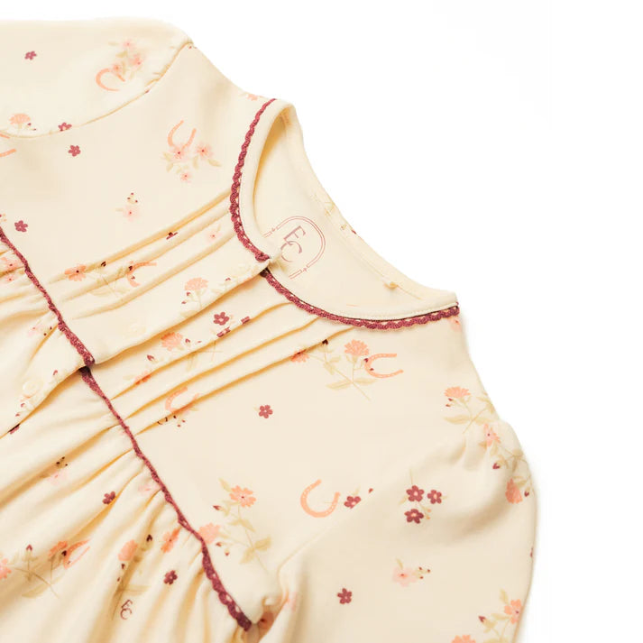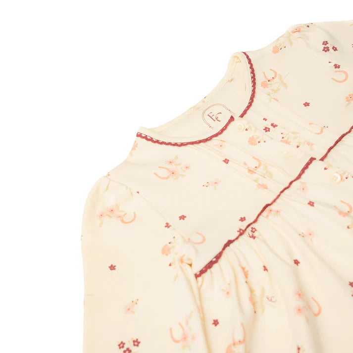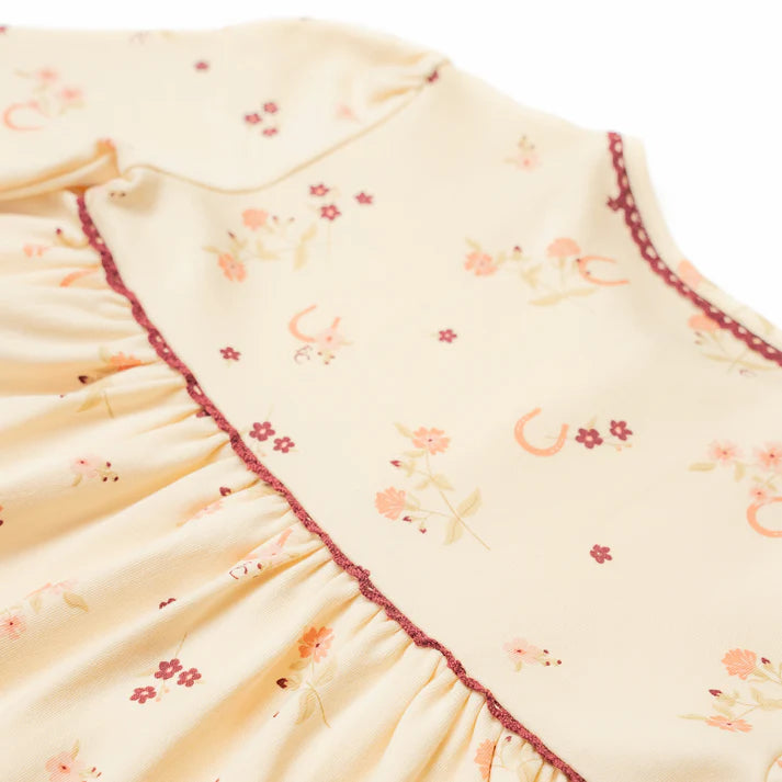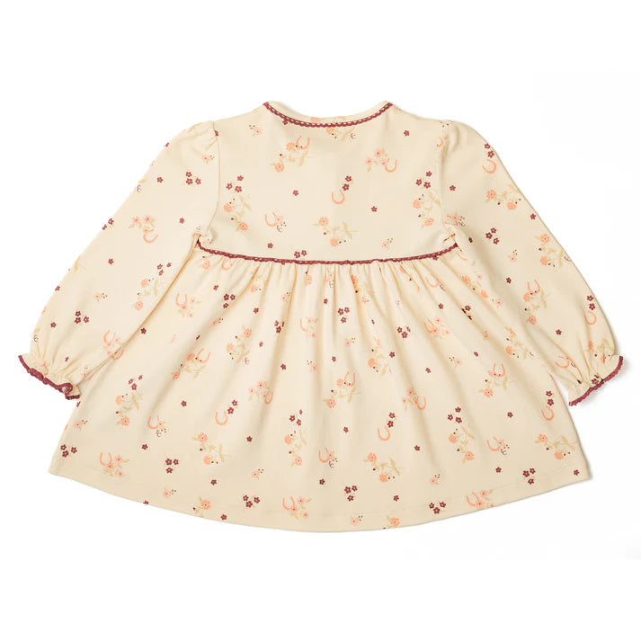 Crafted from 100% super soft organic cotton jersey, this dress is kind to delicate skin and gentle on the environment. It features the brand’s signature Horseshoe Floral Print, elevated by a lovely burgundy cotton lace trim. Designed with a button-down front and placket detailing, this dress is perfect for layering or wearing on its own. Whether for playdates, parties, or everyday wear, it’s a versatile wardrobe staple that looks as beautiful as it feels.
