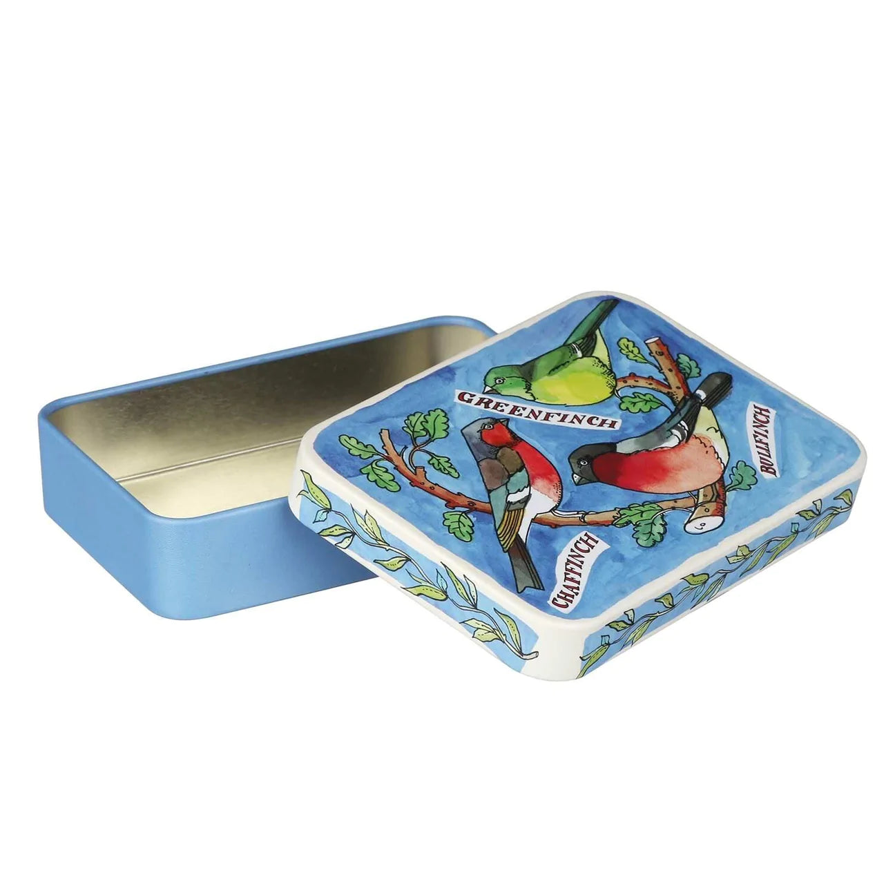 - Featuring different Bird designs, this tin adds a dash of nature to your everyday life. It has a slip-on lid for easy access to your belongings. Whether you need somewhere to store your hair accessories, sewing supplies, sweets or even bird food, this tin provides the perfect storage solution.