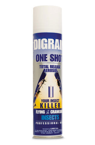 Unique & Innovative Digrain one Shot can be used as a conventional product for the control of flying or crawling insects but more importantly also as a Total release aerosol. Press and (quarter turn) twist nozzle to automatically release. one canister can cover 300sq. metres in 2mins 52 seconds. 30 second burst will cover 50sq. metres - Retwist nozzle and use again. hSE: 7711 Dosage:1 aerosol covers 300 sq m Automatic Fogging Device. Ideal for Cluster Flies, Fruit Flies and Vinegar Flies. ALSO KILLS WASPS. FOR PROFESSIONAL USE ONLY ½ BY PURCHASING THIS PRODUCT YOU CONFIRM THAT YOU ARE EITHER A TRAINED PROFESSIONAL OR WILL BE EMPLOYING A QUALIFIED PERSON TO APPLY THE PRODUCT.