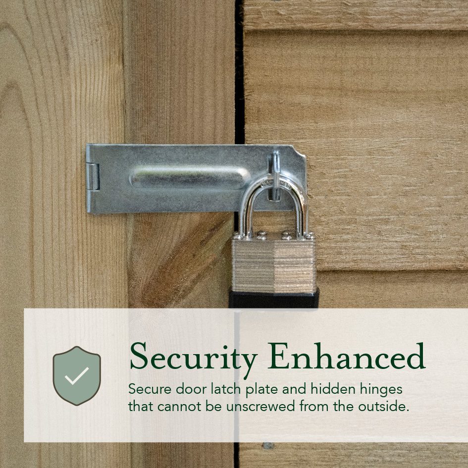 This shed features a double-Z frame door for added strength and improved security, hidden hinges, and a padlock-ready latch. The shatter-proof PET glazing ensures durability and won't yellow over time. Made from certified timber, with a traditional appearance and easy assembly instructions, this shed is the ideal shed for any garden.