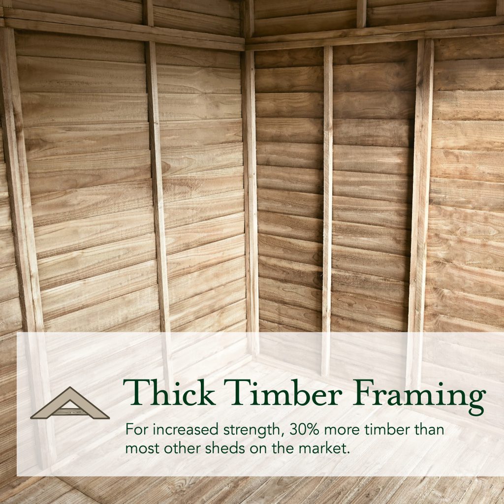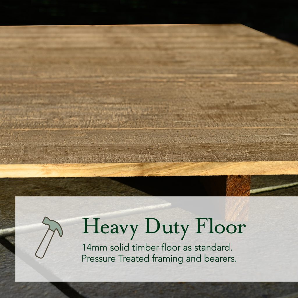 - Solid timber floor as standard, much stronger than standard OSB shed floors