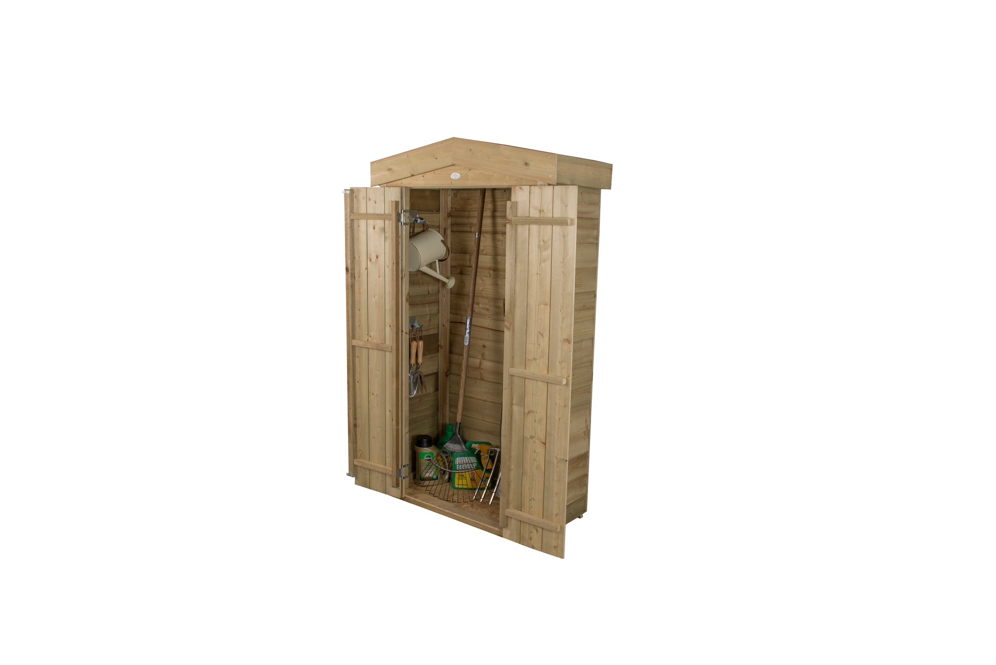 The felted Apex roof keeps the store weathertight and the floor is mounted on Pressure Treated bearers to keep it off the ground and dry. The double doors are fitted with a plate hasp and staple latch that can be securely fastened with an additional padlock.