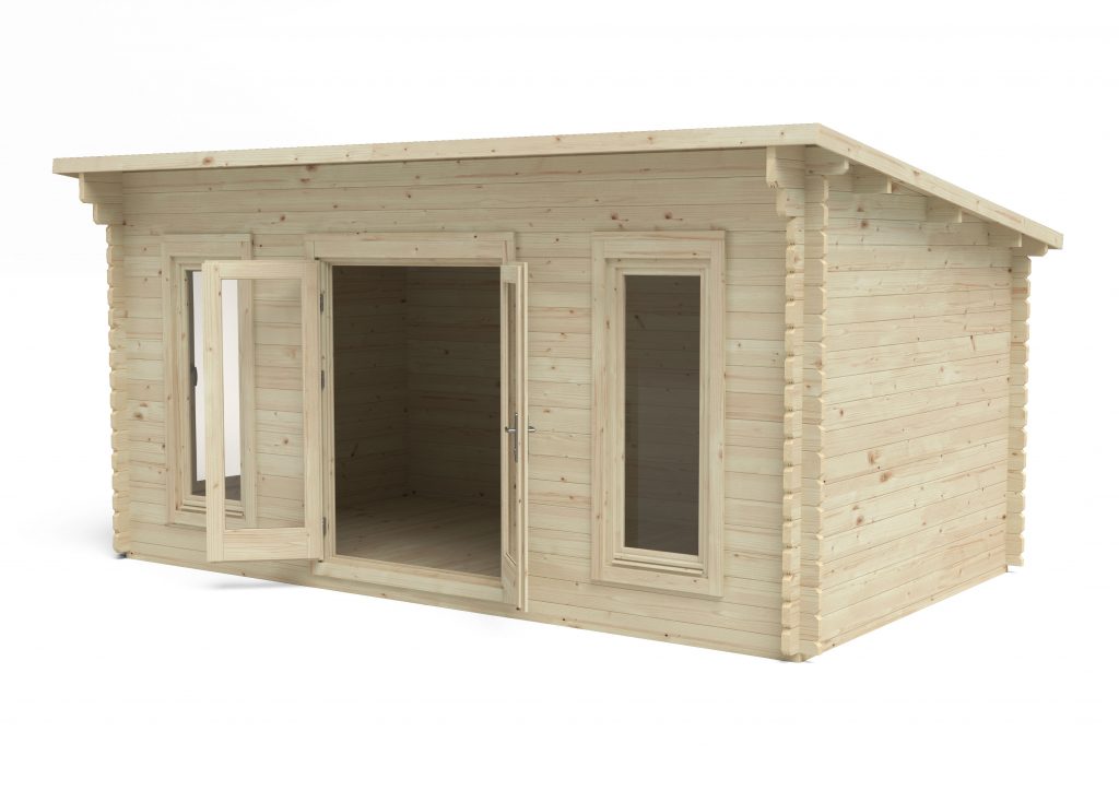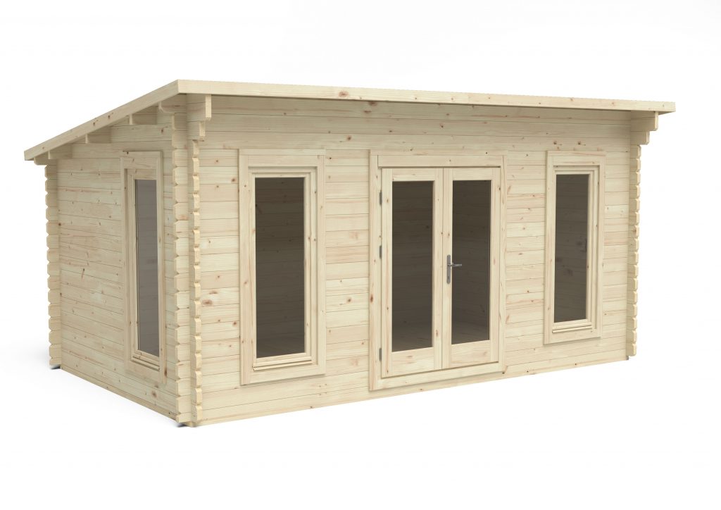 The Elmley Log Cabin is a mid-sized building with a 5m x 3m footprint and a contemporary pent roof design.