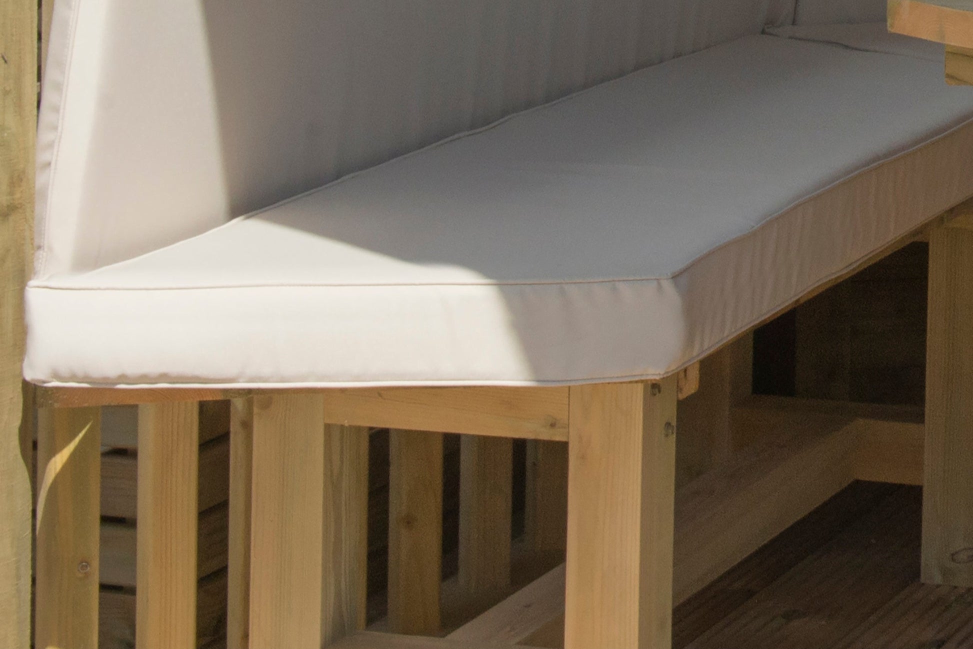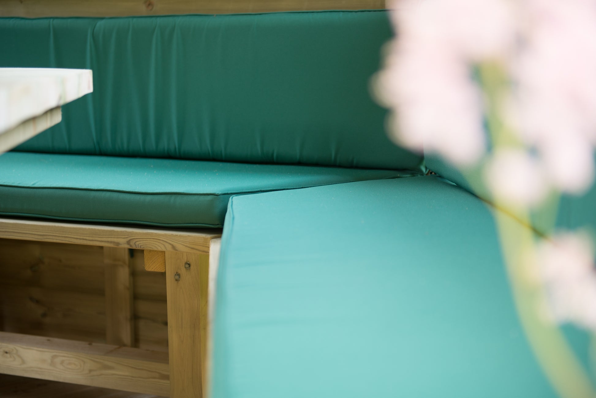 You can choose between a basic decked base, or opt for a furnished version that includes a custom-made table, wooden bench seats with cushions, and seating for up to 10 adults or 14 children (3m) or up to 19 adults or 24 children (4.7m).