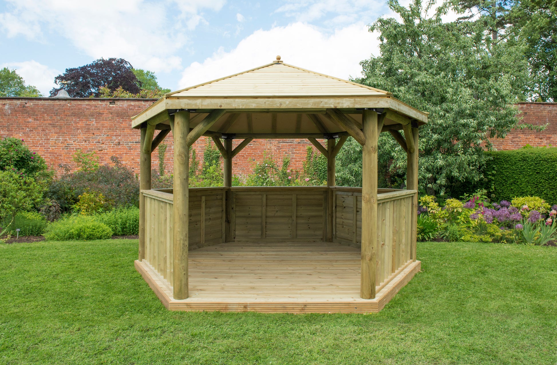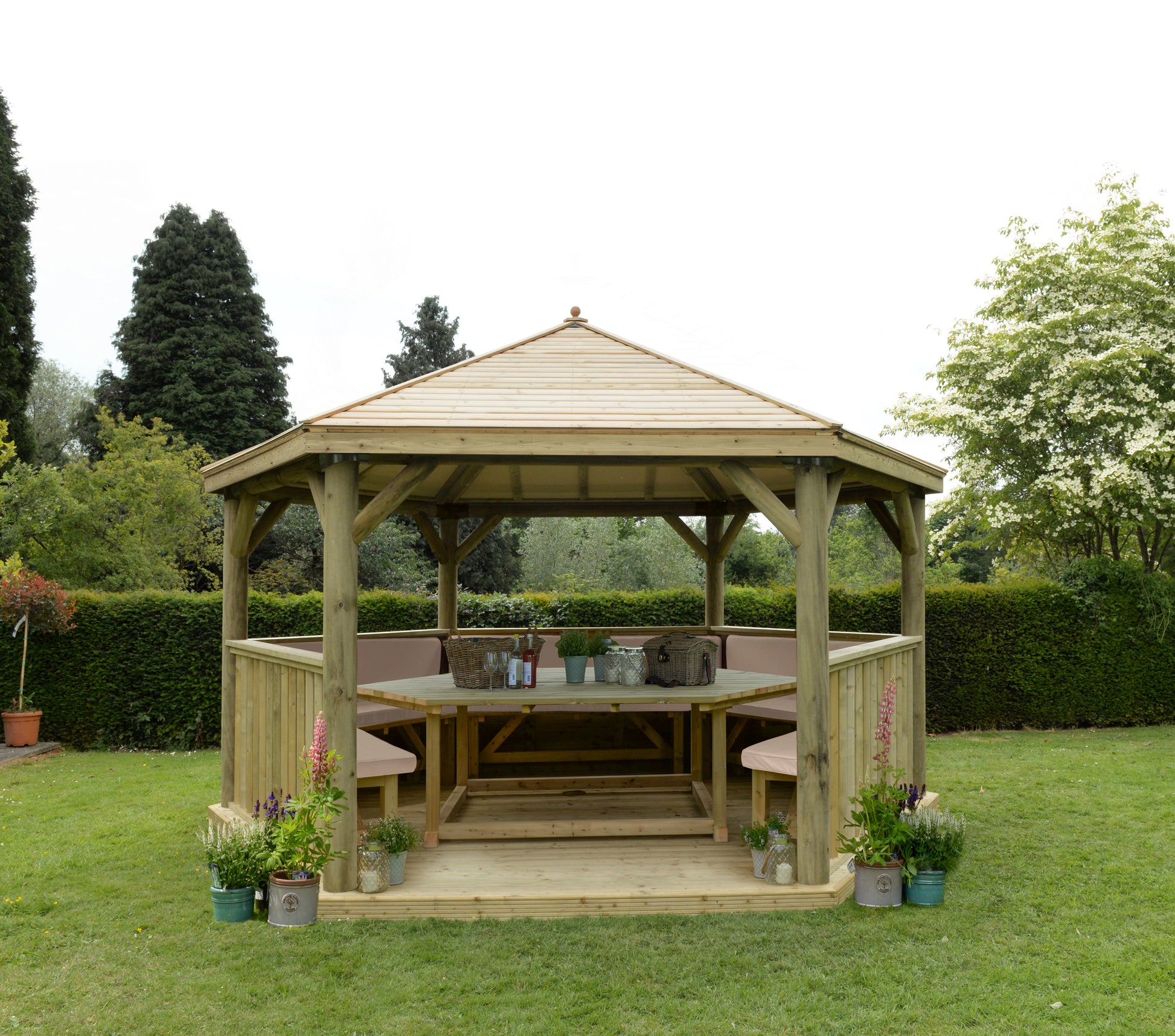 The Hexagonal Wooden Garden Gazebo with Timber Roof from Forest is the perfect outdoor feature for any garden.