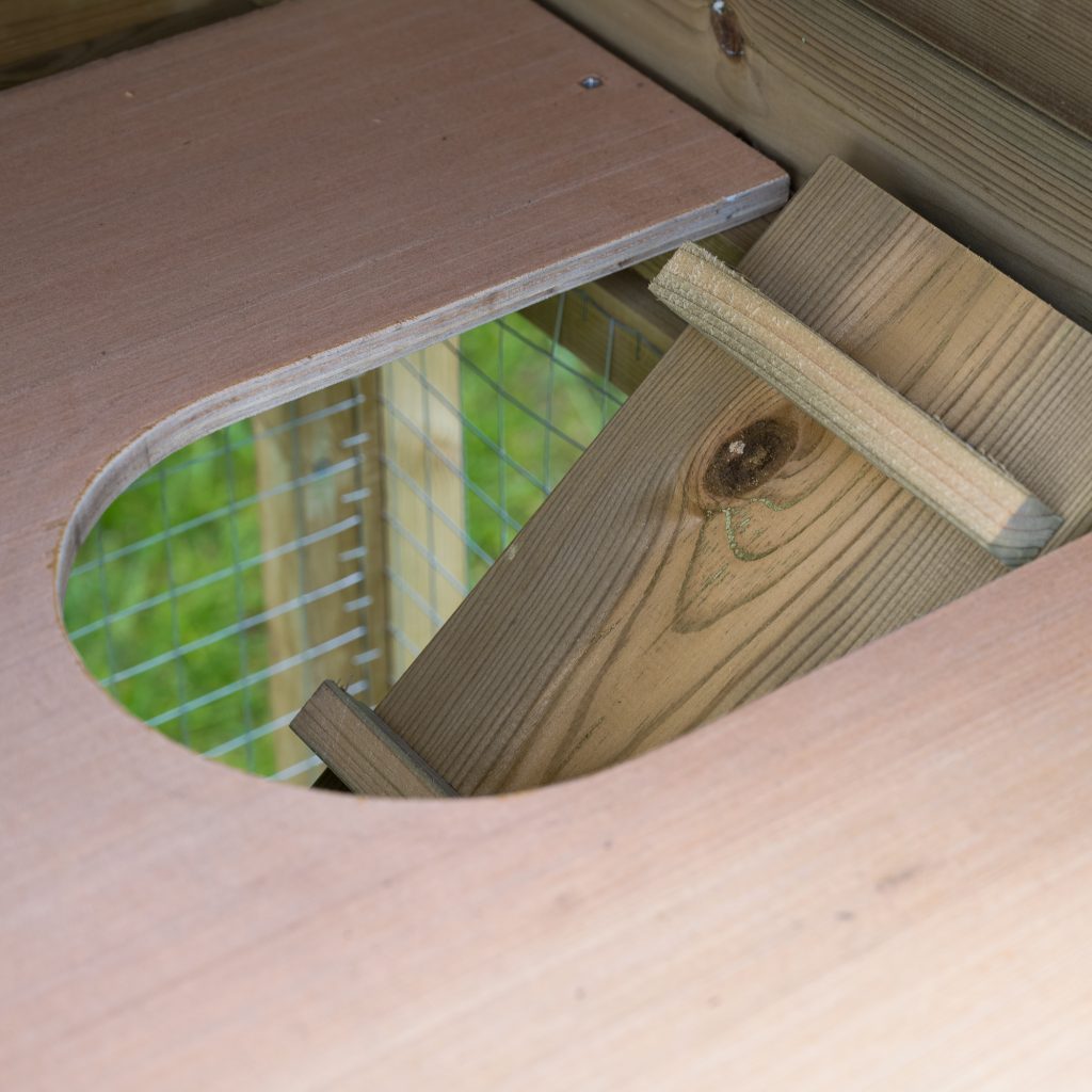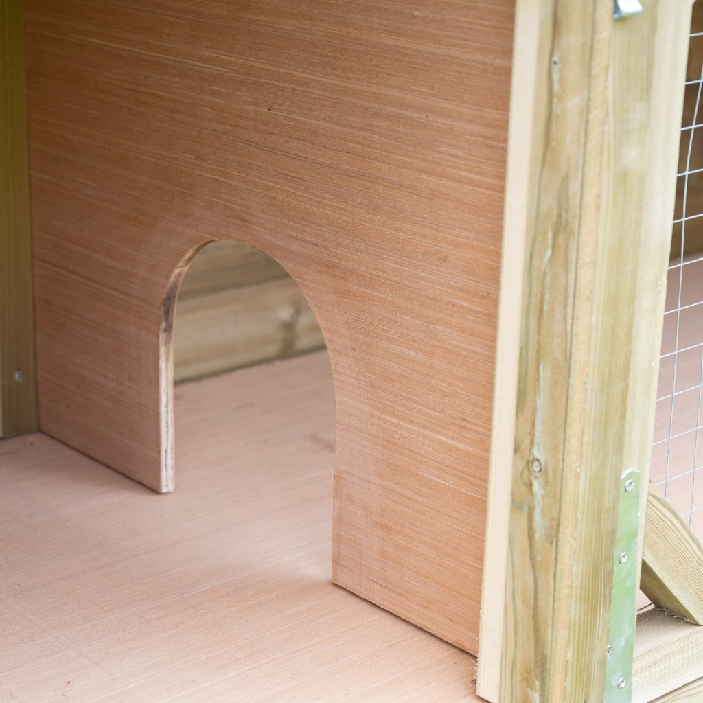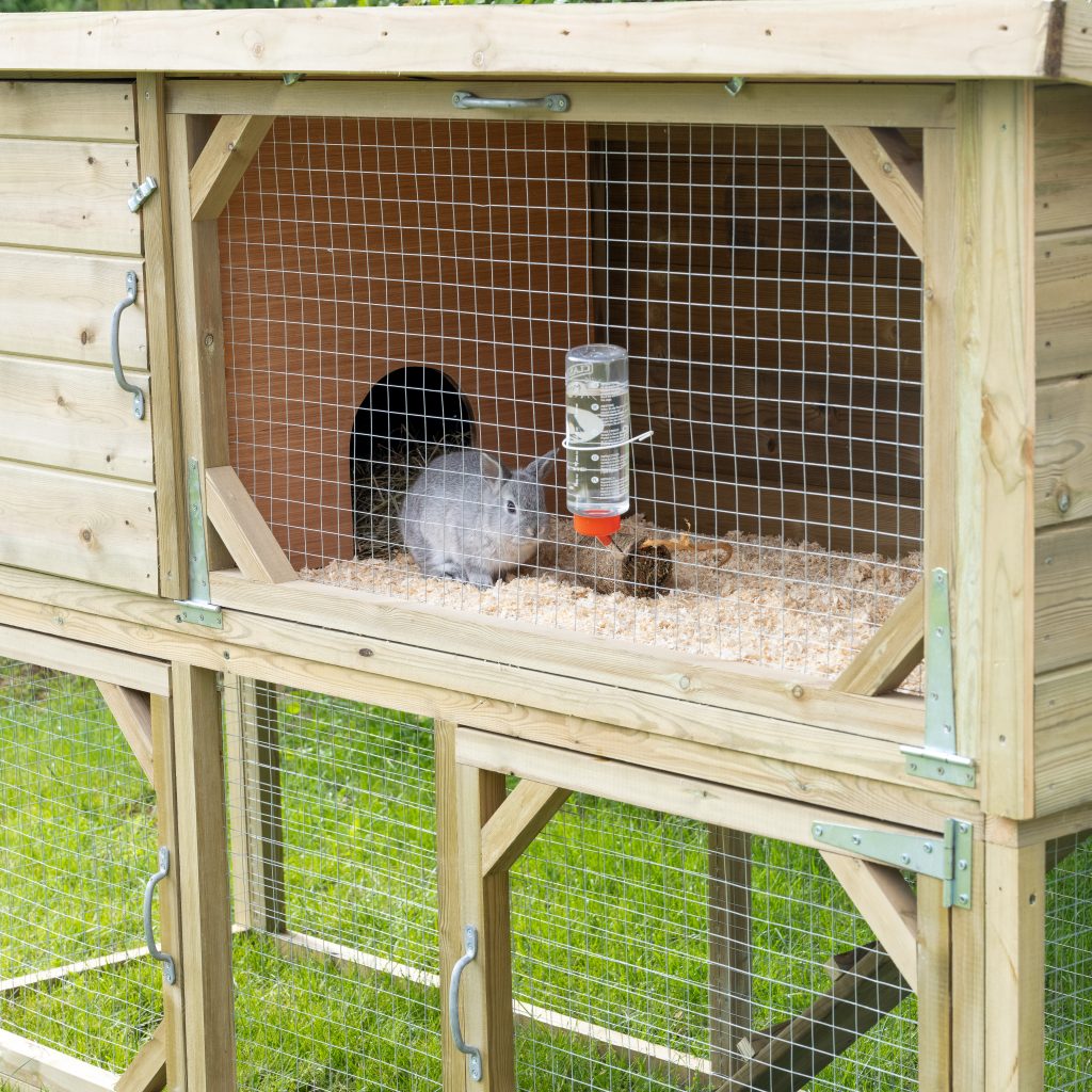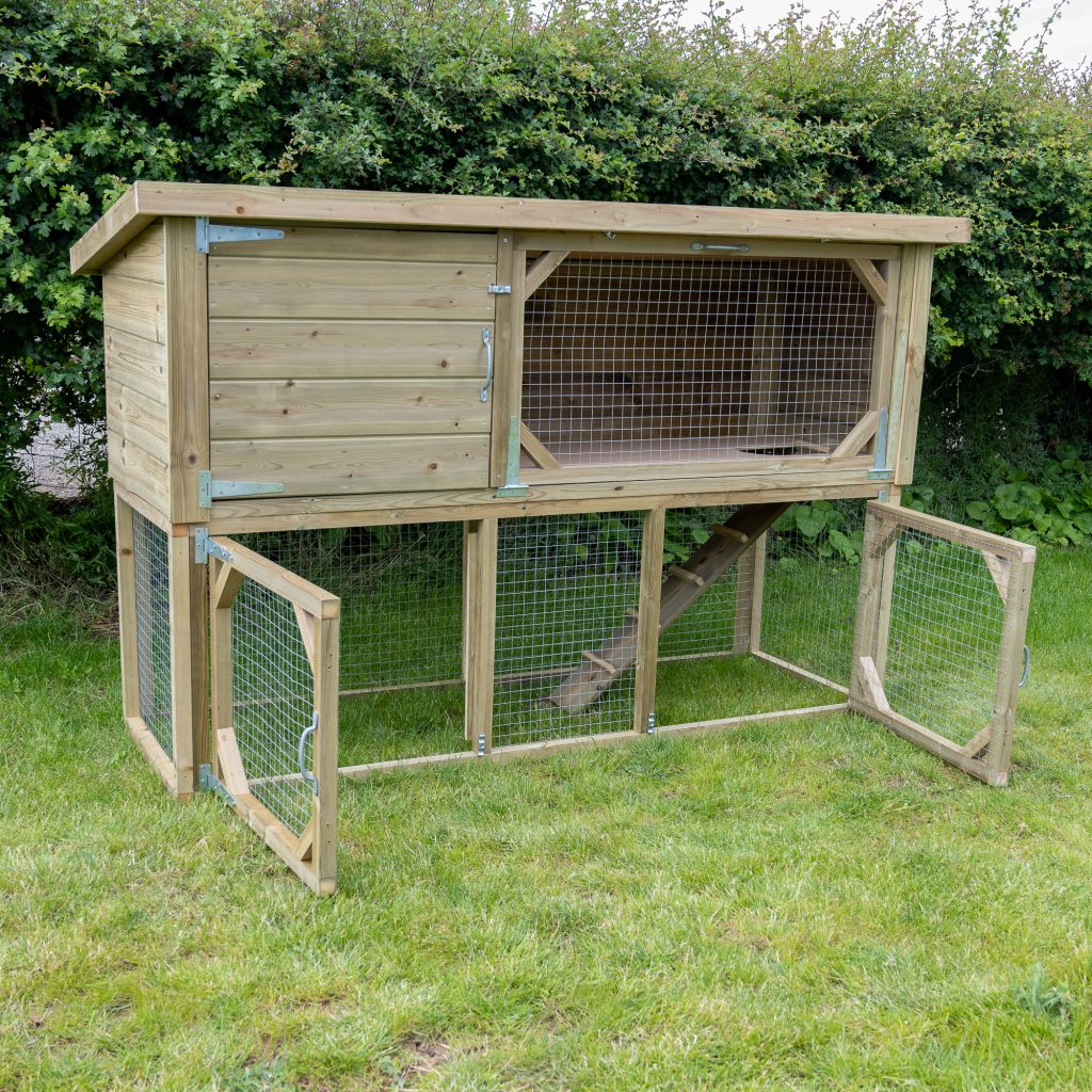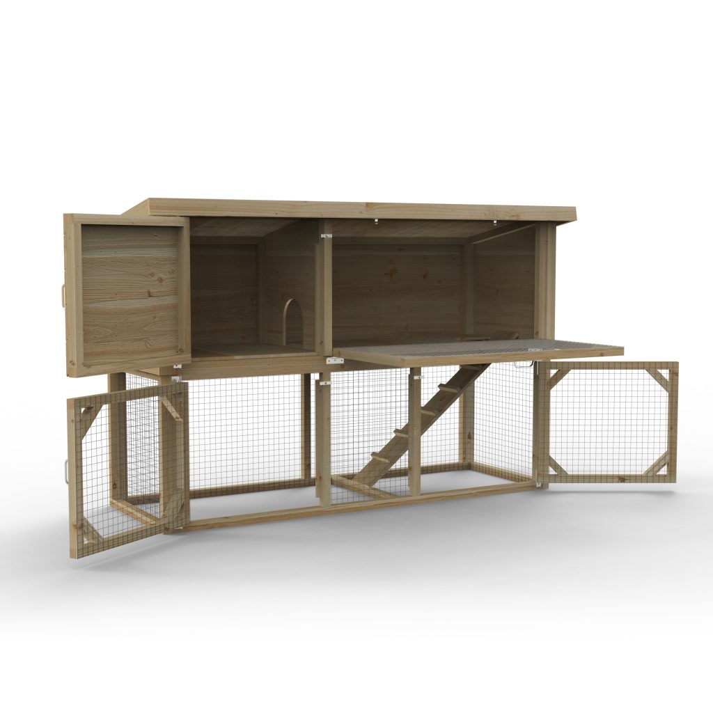 The upper level features a purpose-built bedding and resting area, while the lower level includes an enclosed open-air run. With multiple access points, this hutch ensures easy care and interaction. Crafted from 12mm tongue and groove cladding, it offers durability and strength. Made with treated shiplap and softwood, it comes with a 10-year warranty against rot and insect damage.