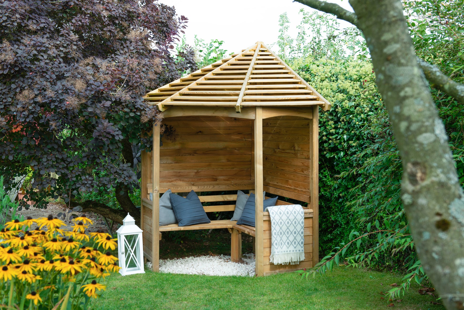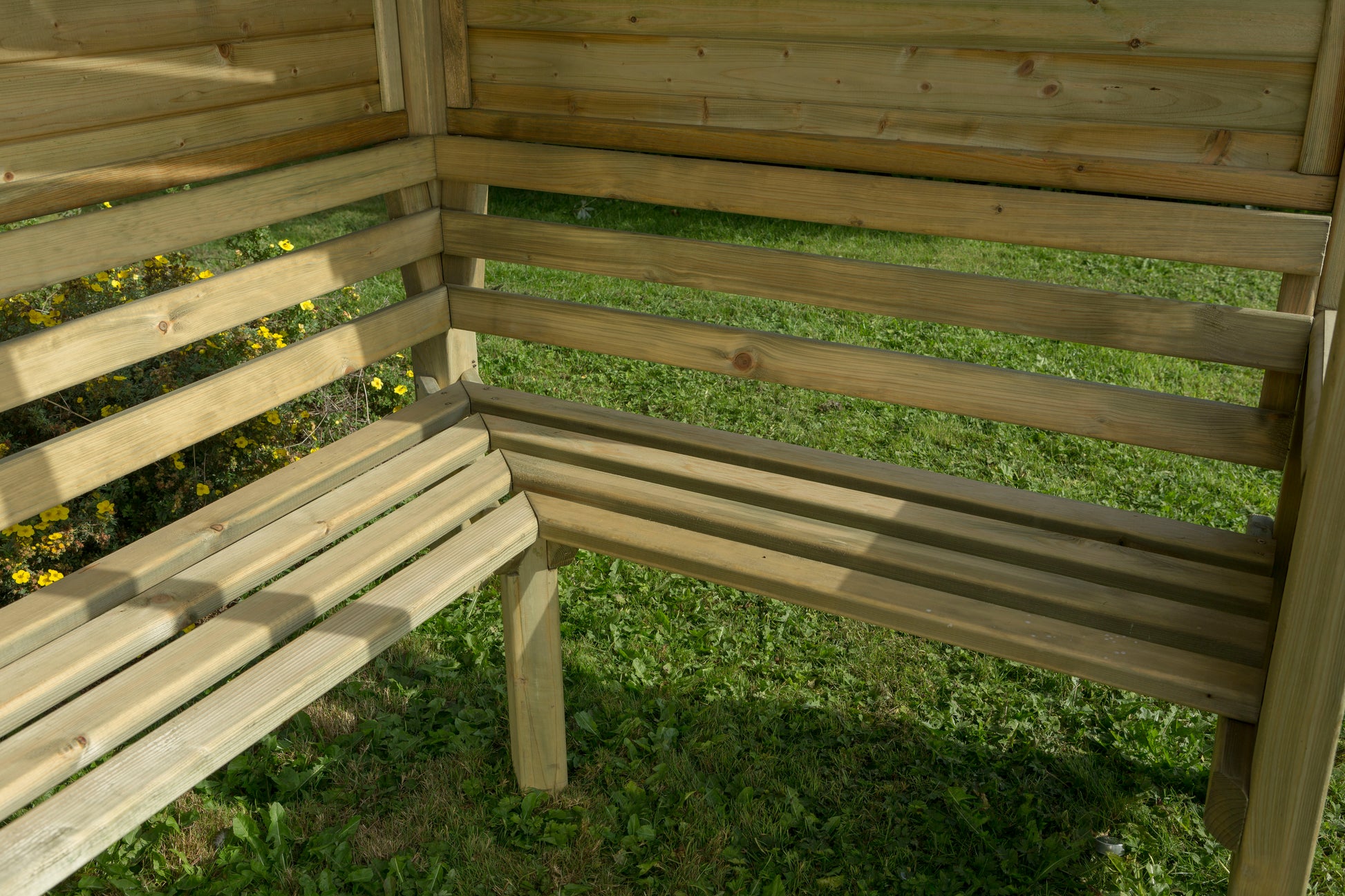 - A slatted roof allows light and air into the arbour while still providing shelter