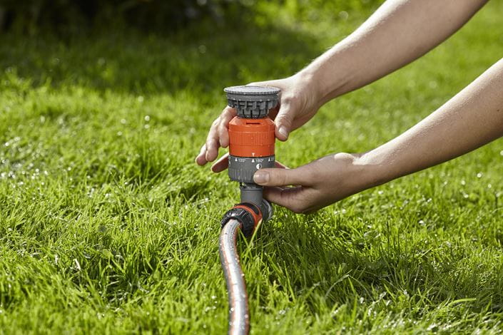 The GARDENA Comfort Circular Sprinkler Vario allows an efficient watering of your small to medium planting areas between 25 and 225 m². It has a maximum range of 17 m in diameter. You can choose the spraying angle from seven 45°-steps, from 90° to 360°, to adjust the garden sprinkler to your needs. The sprinkler-turning turbine ensures an ideal water distribution. This makes the garden irrigation even and free of puddles. With the GARDENA Tap Connector 18201/18221, you can install multiple circular sprinklers in succession. The integrated filter makes cleaning and maintaining the sprinkler easy. Thanks to the integrated metal spike, the sprinkler can be anchored in the ground and stands stable during operation. The sprinkler is compatible with the GARDENA Sprinkler Tripod 2075-20. With this combination, the sprinkler becomes a high-level sprinkler, ideal for watering high plants efficiently.