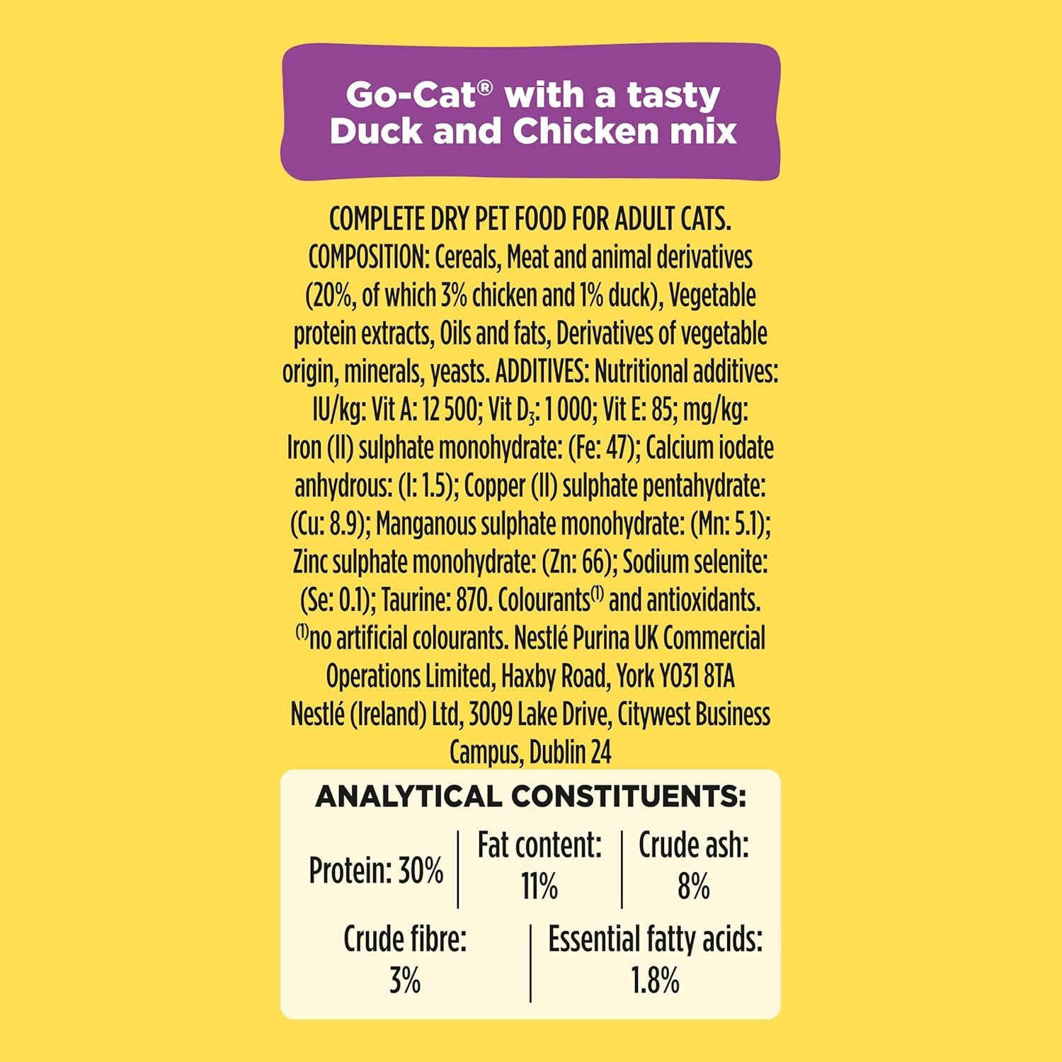 Go-Cat Complete Chicken & Duck Adult Dry Cat Food is a 100% complete & balanced dry food formulated for adult cats, The kibble is composed of Cereals, Meat and Animal Derivatives.