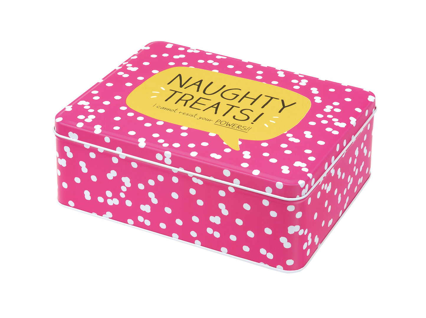 Keep all those naughty sweets in one place with this bright pink tin with yellow speach bubble reading 'Naughty Treat, I cannot resist your Powers'.