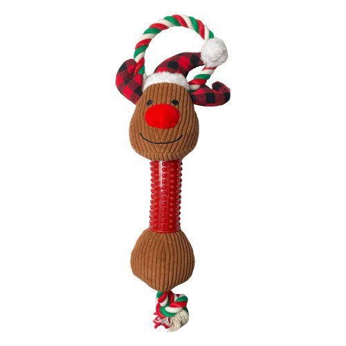 Crafted with a soft corduroy neck for comfort and a sturdy rope for engaging tug-of-war sessions, this durable toy is the perfect way to add some festive fun to your dog's playtime routine. With its unique reindeer design, complete with antlers and a friendly face, your dog will love playing and cuddling with this toy all season long.