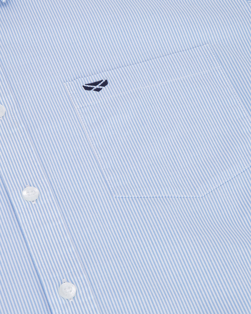 - Pale blue contrast panels in the inner collar stand and inner cuffs