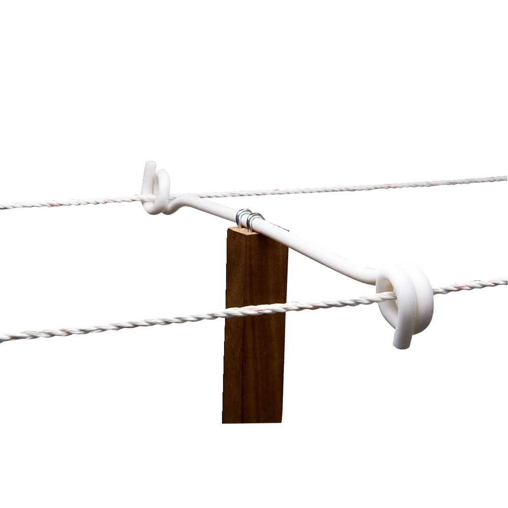 The insulators primary role is to securely hold the fence line without power leaking from post to ground. A well-designed insulator will hold the line securely so that it will not wear the tape, rope or wire when buffeted around by the elements or will allow the line to freely pass through without the impedance of sharp edges. Off-set insulators hold the line away from the post giving extra clearance from hedges and walls, additional insurance from rubbing and chewing or from potential arcing problems if installing on stock fencing. Off-sets are also useful for outwitting pests and predators. Installed at the base of a chicken run provides a 'scare' wire for the incoming predator or can be carefully placed to catch the sensitive ears of burrowing pests. This type of insulator can be positioned at every other post as it is less likely to make contact with intervening posts.
