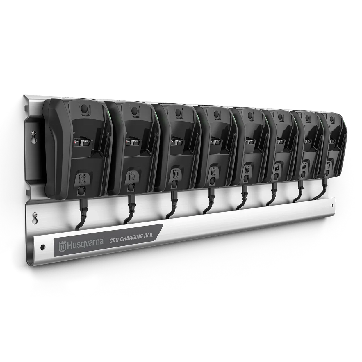 This sleek wall-mounted system can charge up to 8 Husqvarna BLiX 36 Volt batteries overnight, saving space and eliminating tangled cables. With a low-powered and silent design, it includes an aluminium rail, cable, and 8 chargers for easy and organised charging.