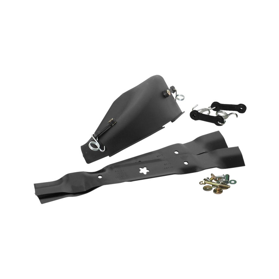 - The kit includes mulching blades and a cover for blocking the ejection duct in the cutting deck.