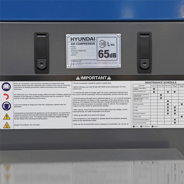 All-in-one Hyundai HYSC100500DVSD integrates a power screw compressor, refrigerated air dryer and air receiver tank, providing a complete solution to produce clean and dry compressed air.
