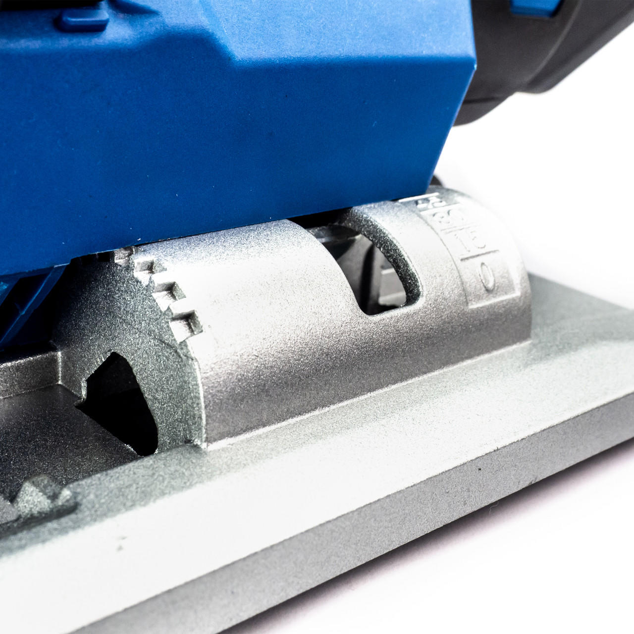 This Hyundai jigsaw is able to cut through up to 80mm of wood, 12mm of plastic and 10mm of steel, making it suitable for a huge range of DIY projects. Featuring a 4-stage pendulum for enhanced control and performance, you can also adjust this jigsaw’s orbital settings for different tasks – the higher the setting, the more power the machine will deliver. Its higher settings are fantastic for quickly cutting through tough materials or for achieving straight cuts, and its lower orbital settings are perfect for curved cuts through steel, plastic and wood.