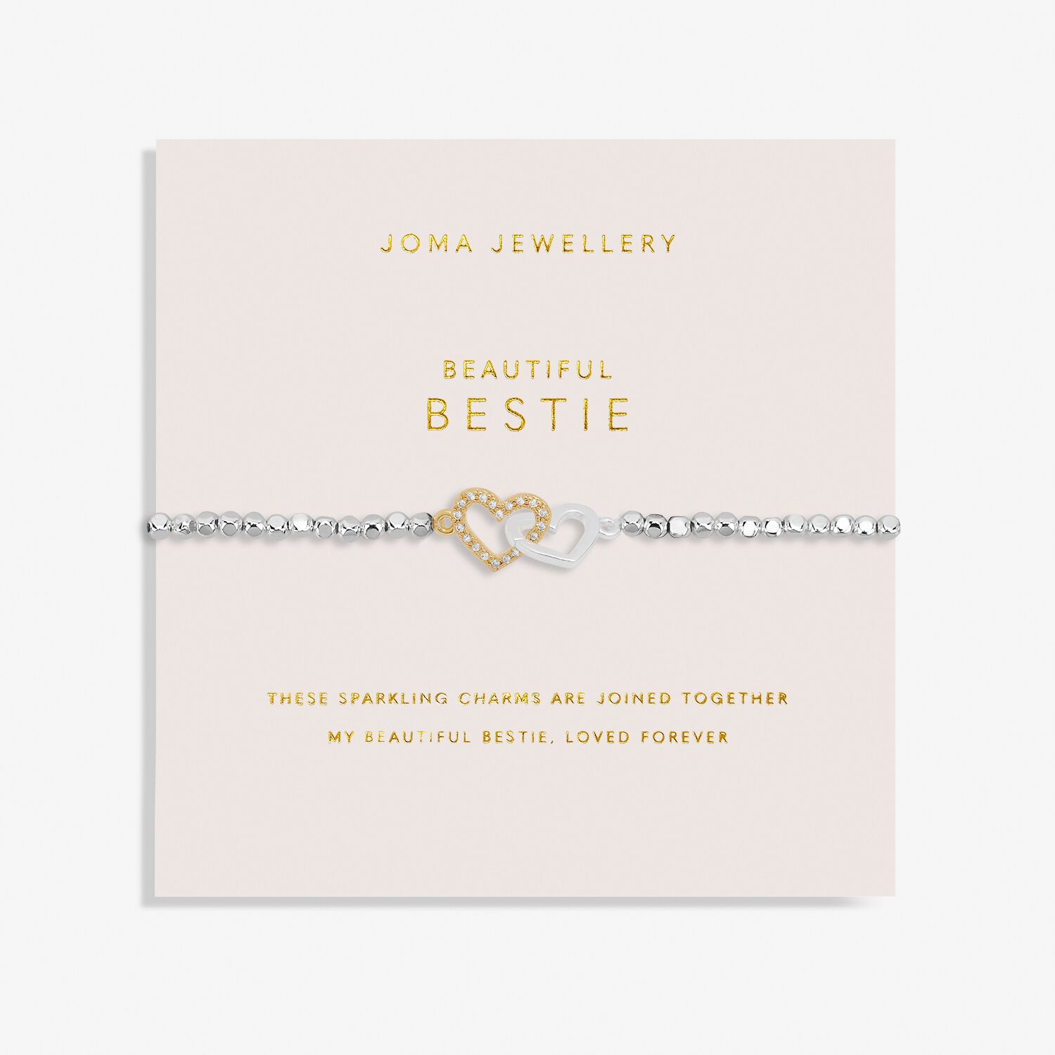 . Crafted with silver and gold-plated hammered beads, this bracelet features two interlocked heart charms, symbolising the love and connection you share with your best friend. Presented on a blush pink sentiment-stamped card, it is designed to be treasured for a lifetime. With its one-size-fits-all design, this bracelet makes a meaningful and timeless gift, perfect for celebrating friendship. Designed and personalised in the UK, it's the ideal way to show your bestie how much they mean to you.
