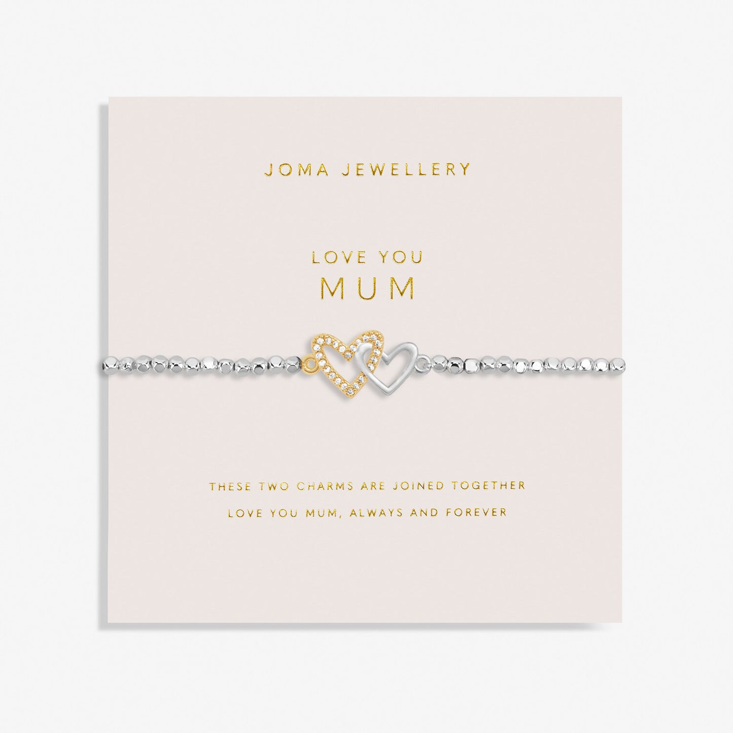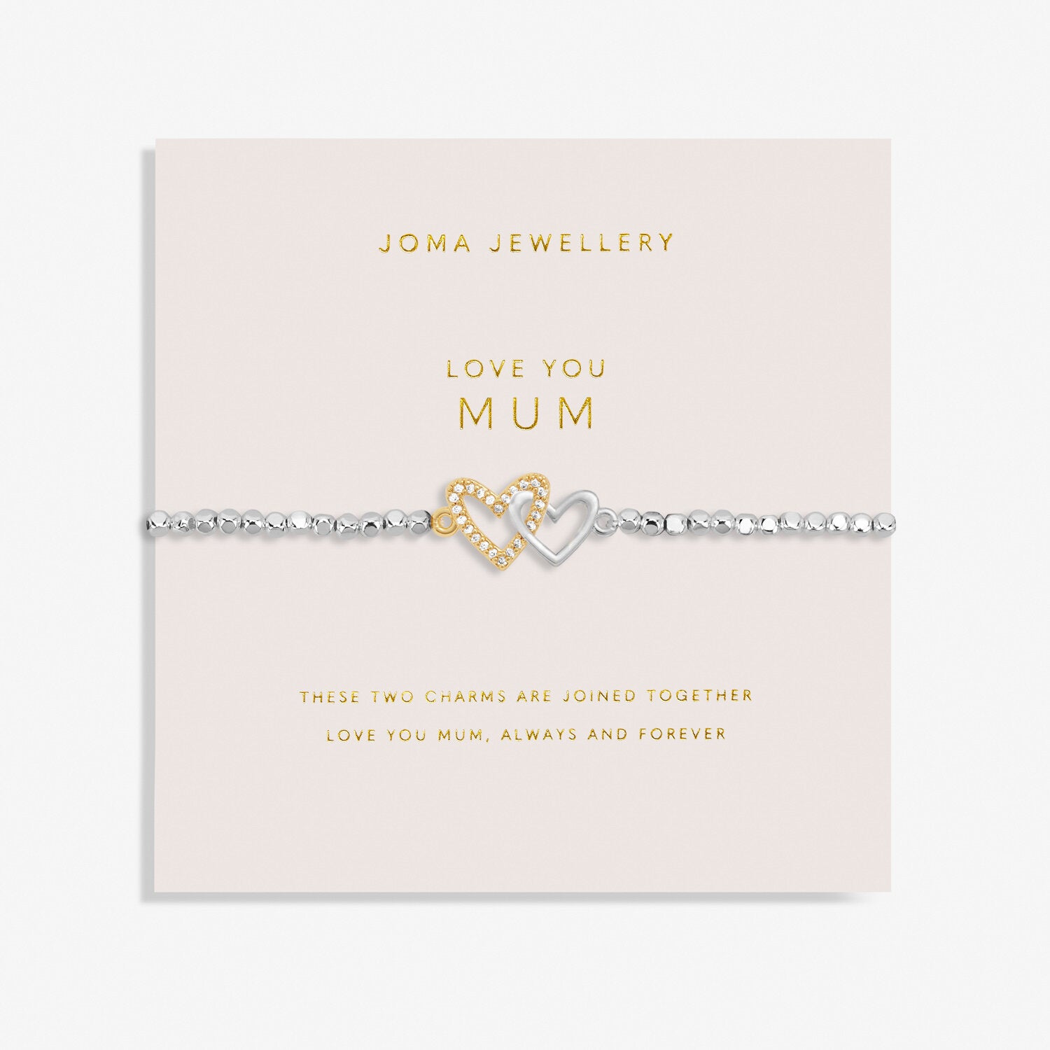 Crafted with silver and gold-plated hammered beads, this bracelet features two interlocked heart charms that symbolise an unbreakable connection. Presented on a blush pink sentiment-stamped card, it makes a meaningful gift for any occasion. Designed to fit all sizes, this bracelet is a timeless keepsake that will be treasured for years to come. Made in the UK, it’s the perfect way to express love for your mum.