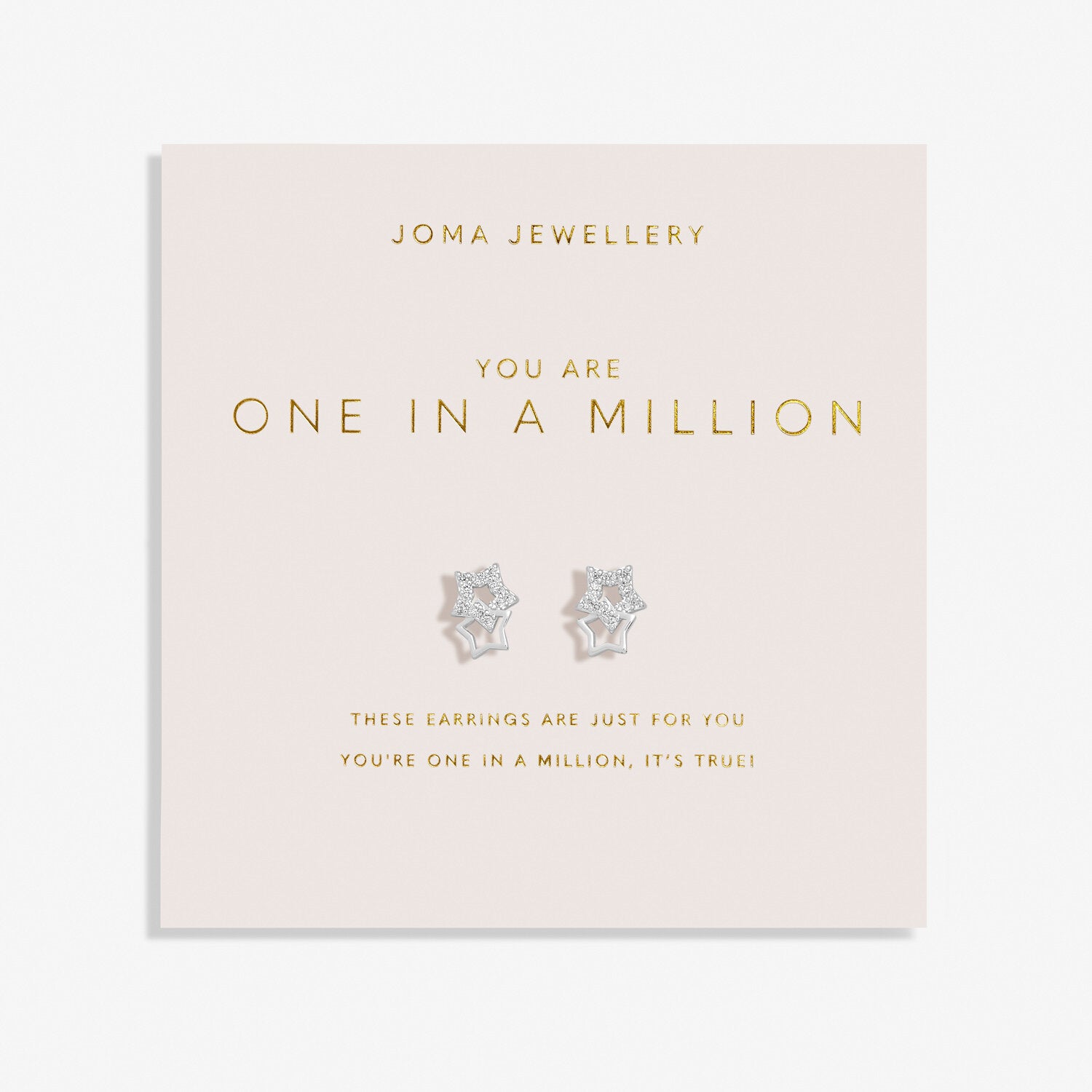 Crafted in silver plating, these interlinked star-drop studs symbolise how unique and cherished the wearer is. Presented on a blush pink sentiment-stamped card, these earrings make the perfect gift for celebrating special occasions or meaningful relationships. Designed in the UK, they are a lasting reminder of just how one in a million the recipient truly is.