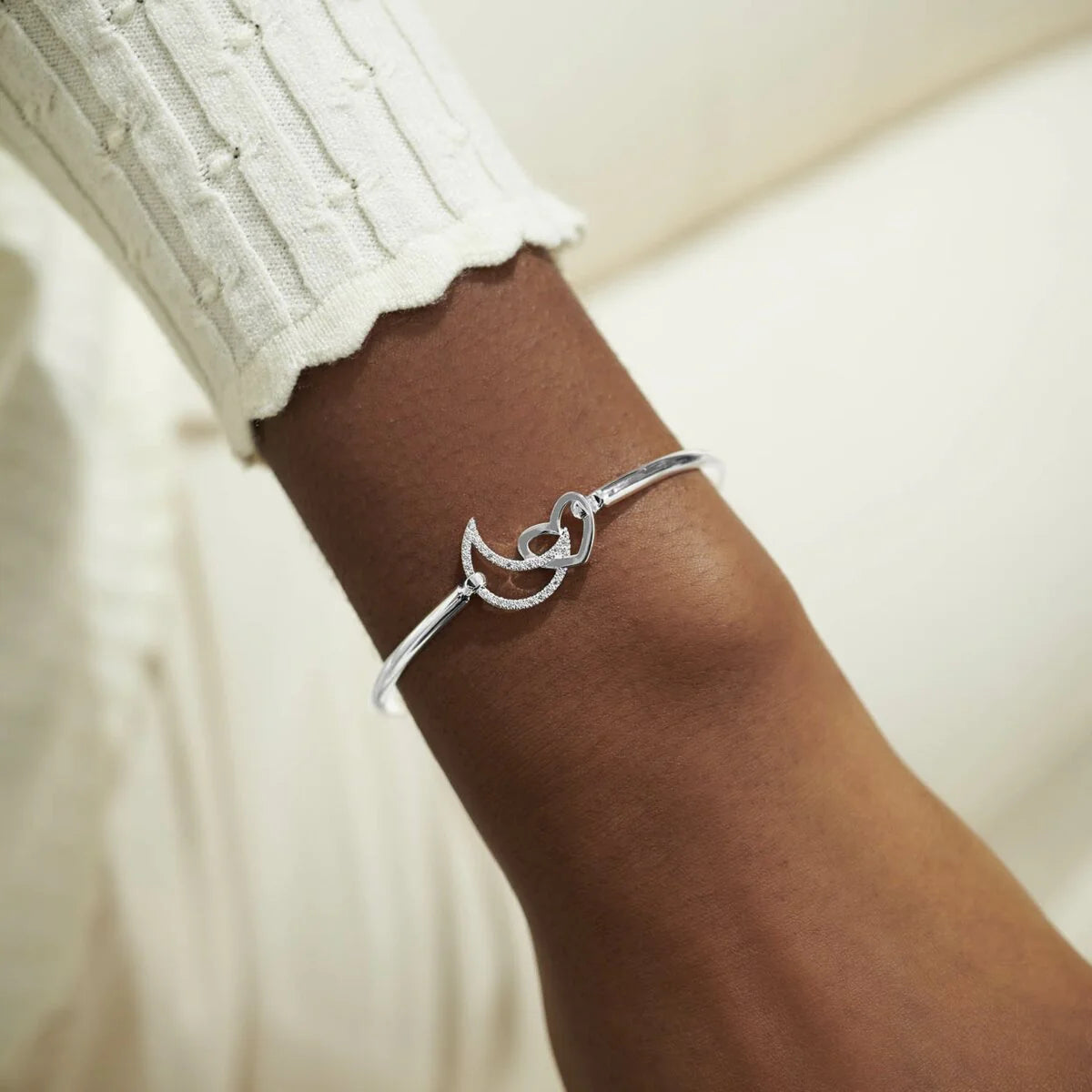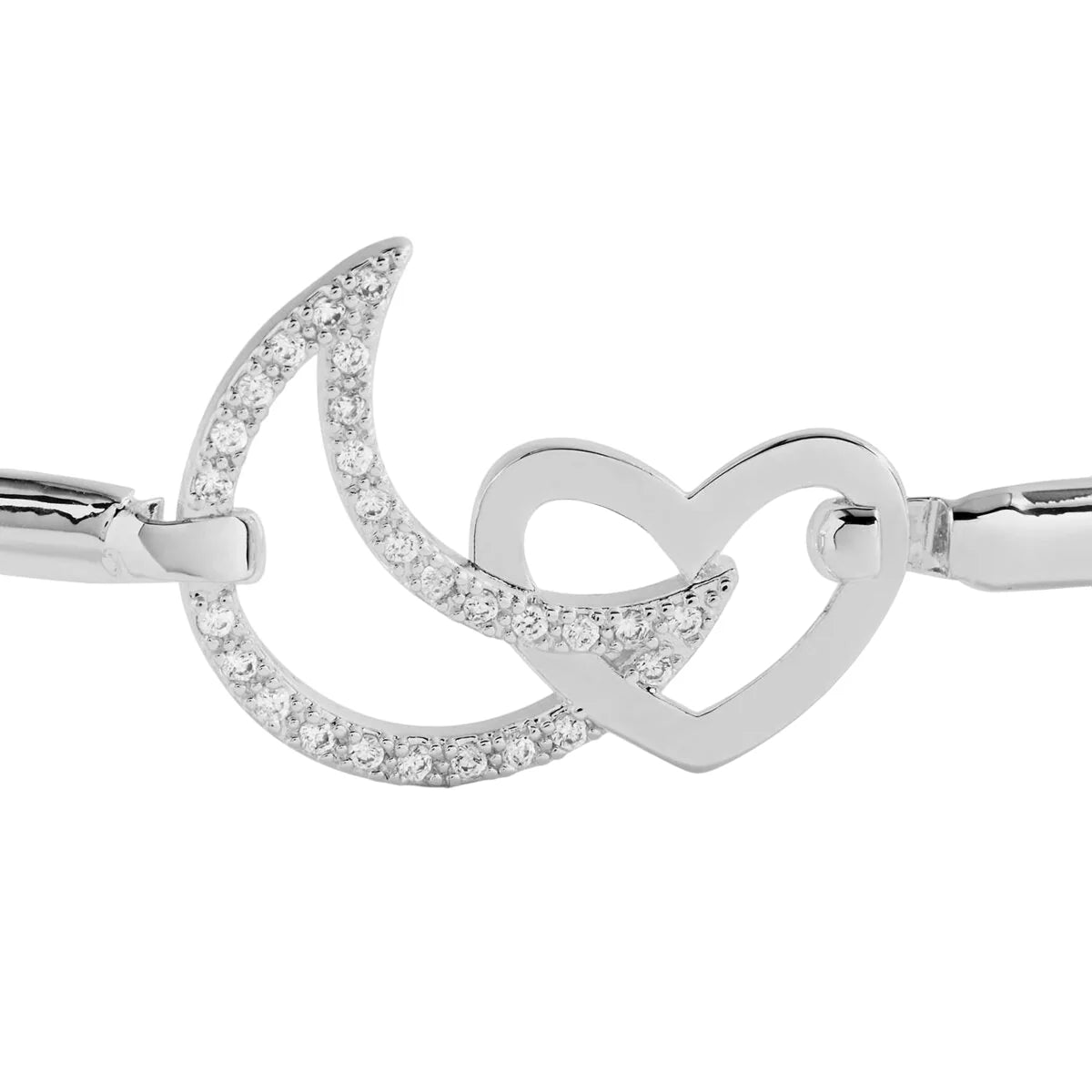 This elegant bangle is crafted from sleek silver-plated brass, featuring a heart-shaped charm that interlocks with a moon, adorned with sparkling pavé crystals.