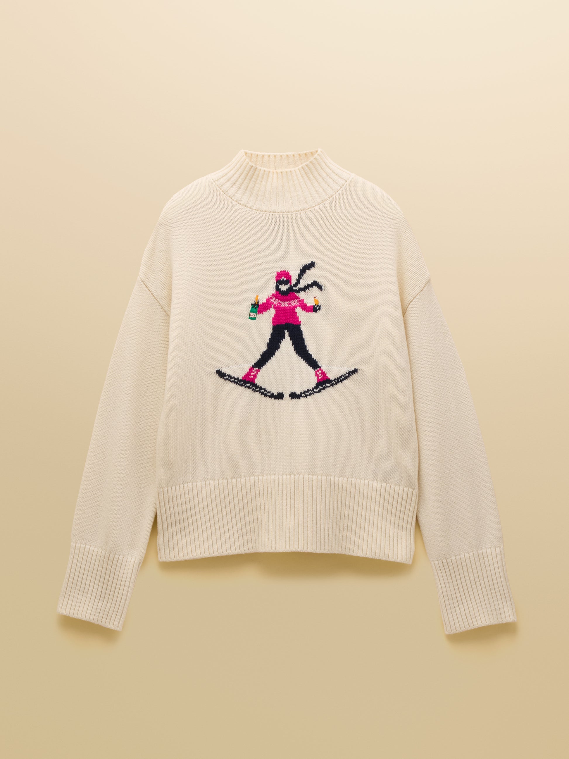 Featuring a vintage ski graphics intarsia and a cotton and wool blend, it's designed with a relaxed fit, dropped shoulders, wide sleeves, and ribbed high neck and hem. Perfect for hitting the slopes or après ski.
